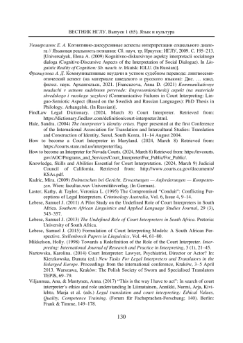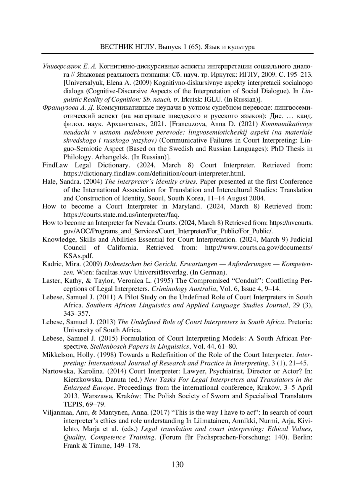 16. Французова А. Д. Коммуникативные неудачи в устном судебном переводе: лингвосемиотический аспект (на материале шведского и русского языков): Дис. … канд. филол. наук. Архангельск, 2021. EDN: CMVBAW