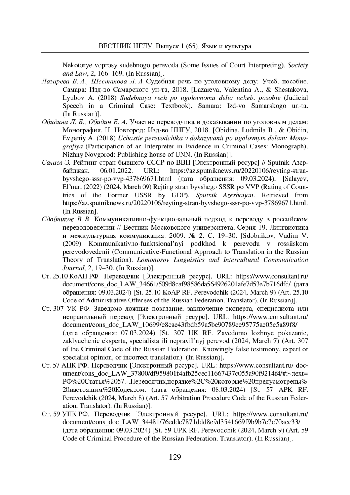 14. Ст. 59 УПК РФ. Переводчик [Электронный ресурс]. URL: https://www.consultant.ru/ document/cons_doc_LAW_34481/76eddc7871ddd8e9d3541669f9b9b7c7c70acc33/ (дата обращения: 09.03.2024).