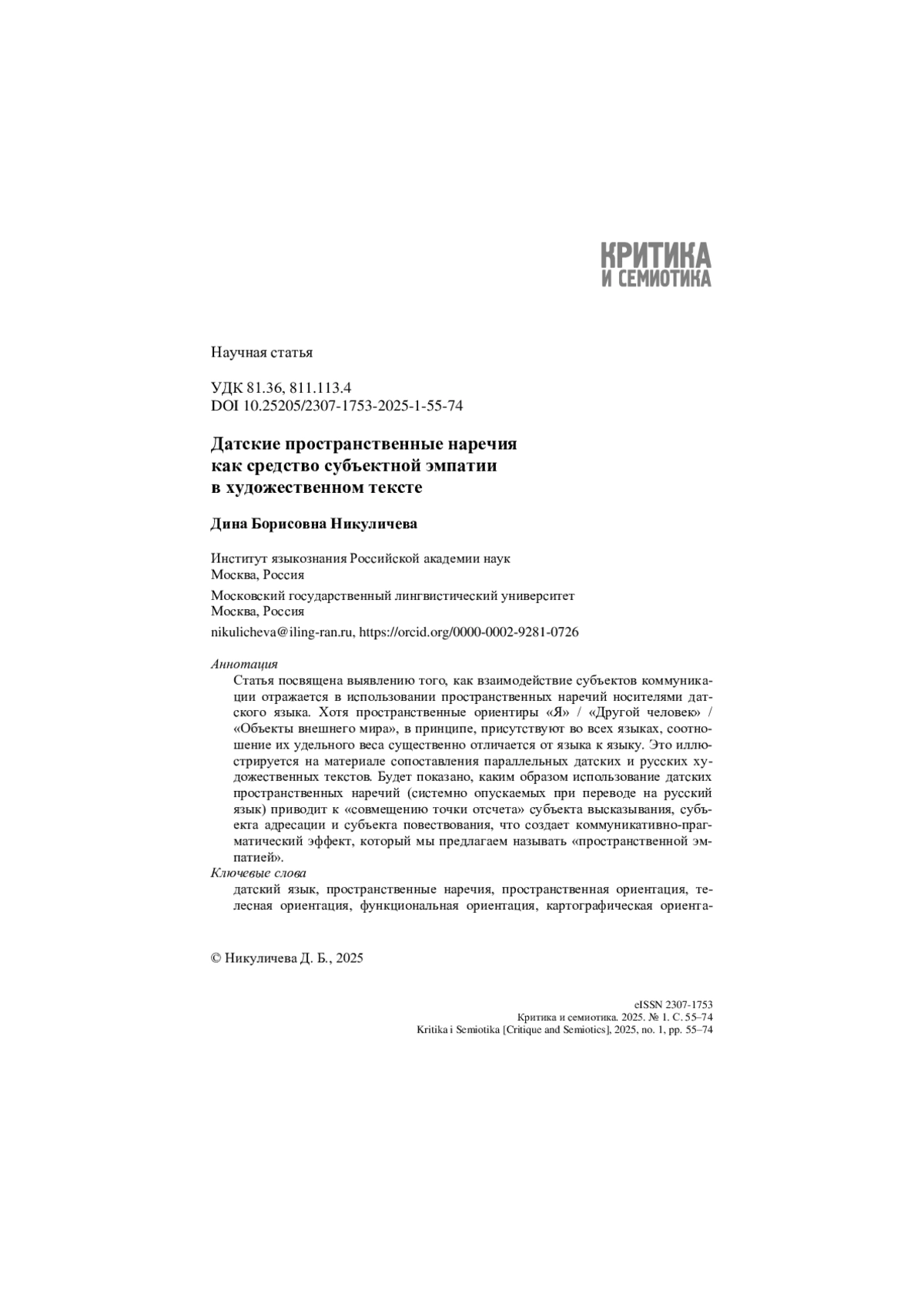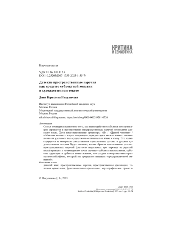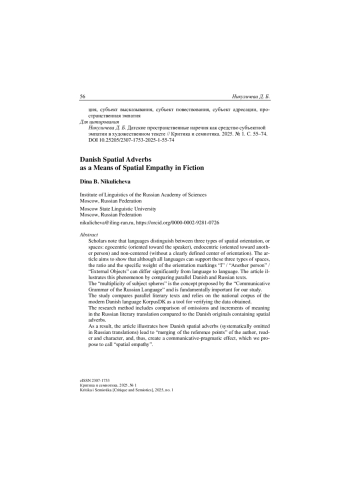 Статья посвящена выявлению того, как взаимодействие субъектов коммуникации отражается в использовании пространственных наречий носителями датского языка. Хотя пространственные ориентиры «Я» / «Другой человек» / «Объекты внешнего мира», в принципе, присутствуют во всех языках, соотношение их удельного веса существенно отличается от языка к языку. Это иллюстрируется на материале сопоставления параллельных датских и русских художественных текстов. Будет показано, каким образом использование датских пространственных наречий (системно опускаемых при переводе на русский язык) приводит к «совмещению точки отсчета» субъекта высказывания, субъекта адресации и субъекта повествования, что создает коммуникативно-прагматический эффект, который мы предлагаем называть «пространственной эмпатией».