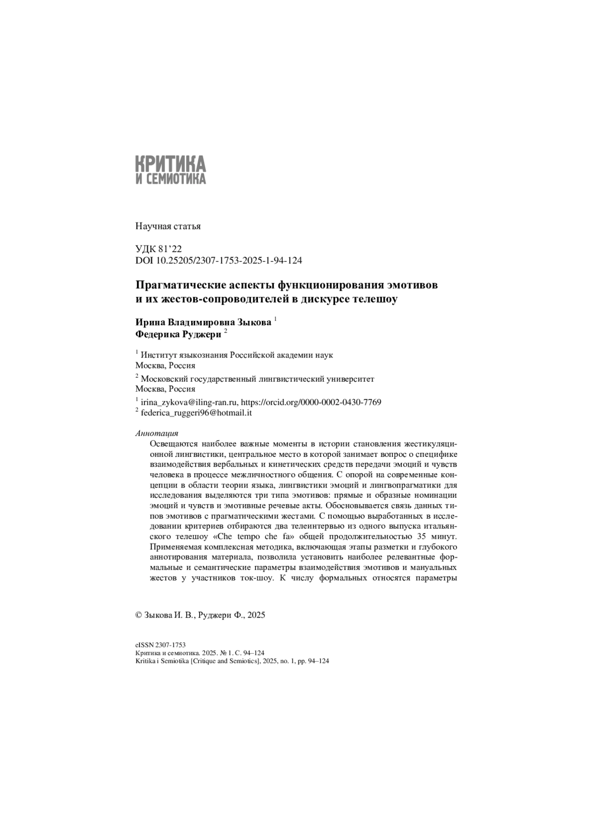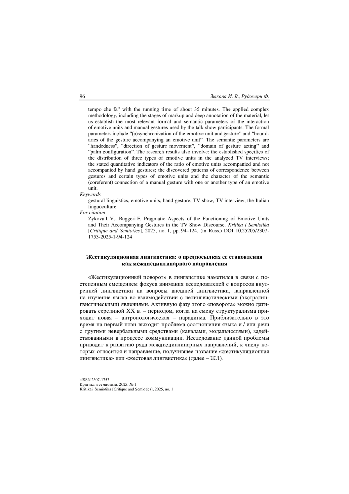 Освещаются наиболее важные моменты в истории становления жестикуляционной лингвистики, центральное место в которой занимает вопрос о специфике взаимодействия вербальных и кинетических средств передачи эмоций и чувств человека в процессе межличностного общения. С опорой на современные концепции в области теории языка, лингвистики эмоций и лингвопрагматики для исследования выделяются три типа эмотивов: прямые и образные номинации эмоций и чувств и эмотивные речевые акты. Обосновывается связь данных типов эмотивов с прагматическими жестами. С помощью выработанных в исследовании критериев отбираются два телеинтервью из одного выпуска итальянского телешоу «Che tempo che fa» общей продолжительностью 35 минут. Применяемая комплексная методика, включающая этапы разметки и глубокого аннотирования материала, позволила установить наиболее релевантные формальные и семантические параметры взаимодействия эмотивов и мануальных жестов у участников ток-шоу. К числу формальных относятся параметры «(а)синхронизация эмотива и жеста» и «границы жеста относительно эмотива»; а к семантическим параметрам – «выбор жестикуляционной руки», «направление движения жеста», «зона действия жеста» и «конфигурация ладони». К основным результатам исследования также относятся: выявленная специфика распределения трех типов эмотивов в анализируемых телеинтервью; установ-ленные количественные показатели соотношения эмотивов, сопровождаемых и не сопровождаемых мануальными жестами; обнаруженные закономерности в сопровождении жестами определенных типов эмотивов и характер семантической (кореферентной) связи мануального жеста с тем или иным типом эмотива.