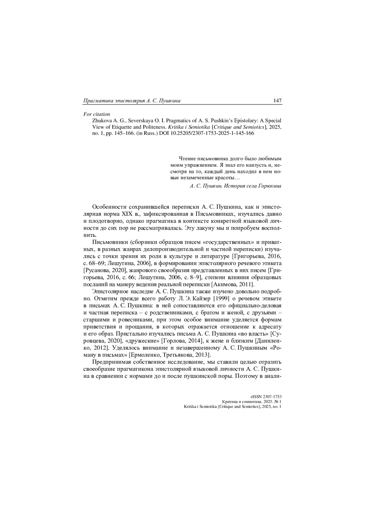 Представлена модель прагматикона «эпистолярной» языковой личности А. С. Пушкина, отразившейся в оценках писем, переписки, адресатов и в языке письма. С помощью корпусных инструментов исследуются композиционные элементы писем и выбор этикетных формул, их жанровые особенности, речевое моделирование образов адресанта и адресата, невербальные элементы переписки, рассматриваются оценочные эпитеты, характеризующие письмо, определяются принципы эпистолярной вежливости. Особое внимание авторы обращают на соотношение пушкинского «эпистолярного кодекса» и норм переписки, отраженных в Письмовниках 1822 и 1877 гг., и видят влияние А. С. Пушкина на развитие эпистолярных стилей, жанров и норм в демократизации официального стиля, различении внешней и внутренней деловой переписки и дружеских писем по делу, в семантическом развитии эпистолярной терминологии.