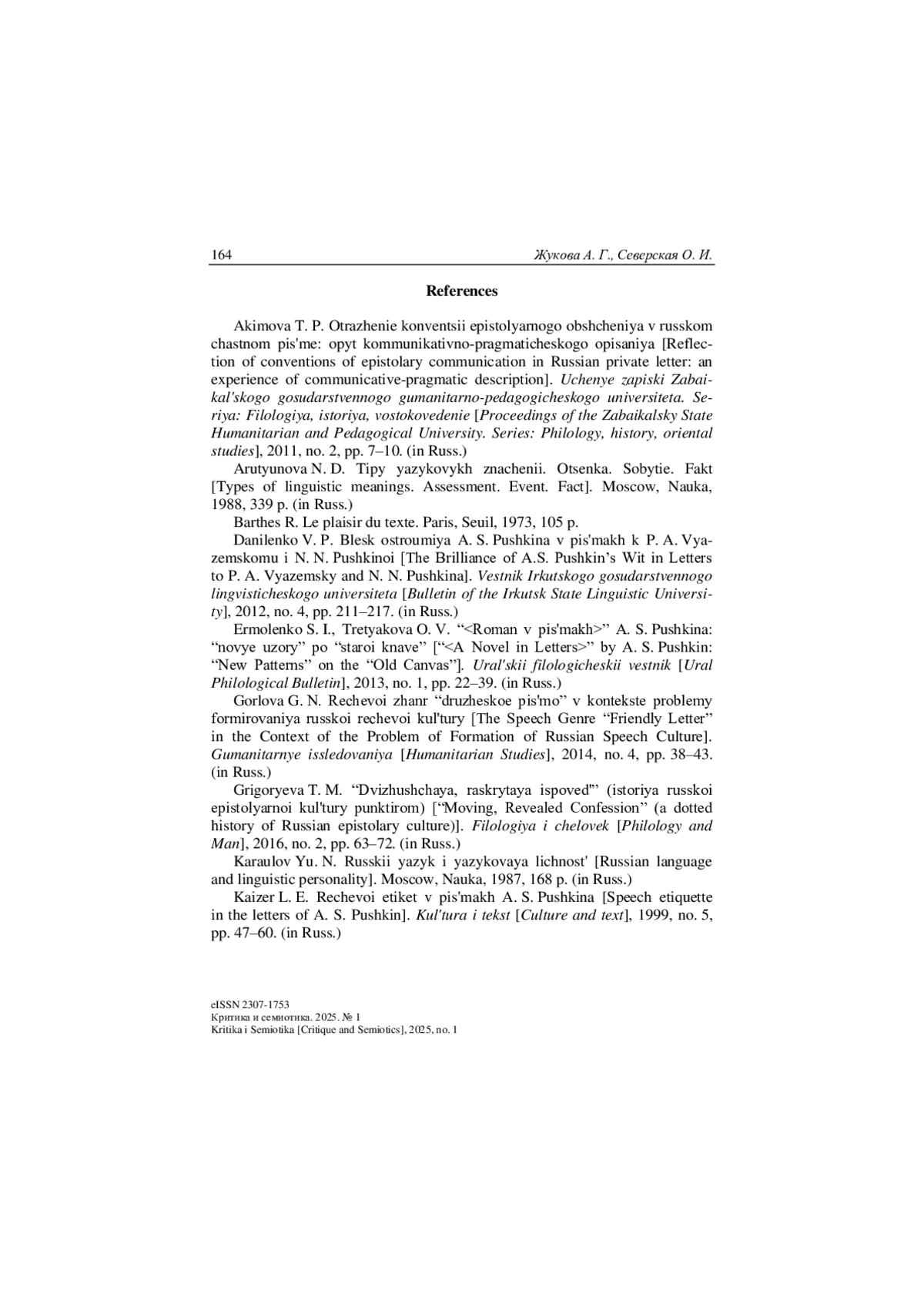 1. Акимова Т. П. Отражение конвенций эпистолярного общения в русском частном письме: опыт коммуникативно-прагматического описания // Учен. зап. Забайкальского гос. гуманит.-пед. ун-та им. Н. Г. Чернышевского. Серия: Филология, история, востоковедение. 2011. № 2. С. 7-10.
