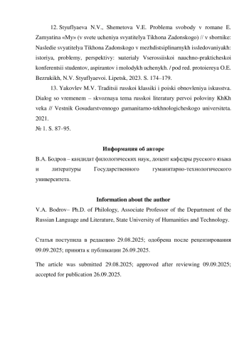 12. Стюфляева Н.В., Шеметова В.Е. Проблема свободы в романе Е. Замятина “Мы” (в свете учения святителя Тихона Задонского) // В сборнике: Наследие святителя Тихона Задонского в междисциплинарных исследованиях: история, проблемы, перспективы: материалы Всероссийской научно-практической конференции студентов, аспирантов и молодых ученых/ под редакцией протоиерея О.Е. Безруких, Н.В. Стюфляевой. Липецк, 2023. С. 174-179. EDN: CHILYW