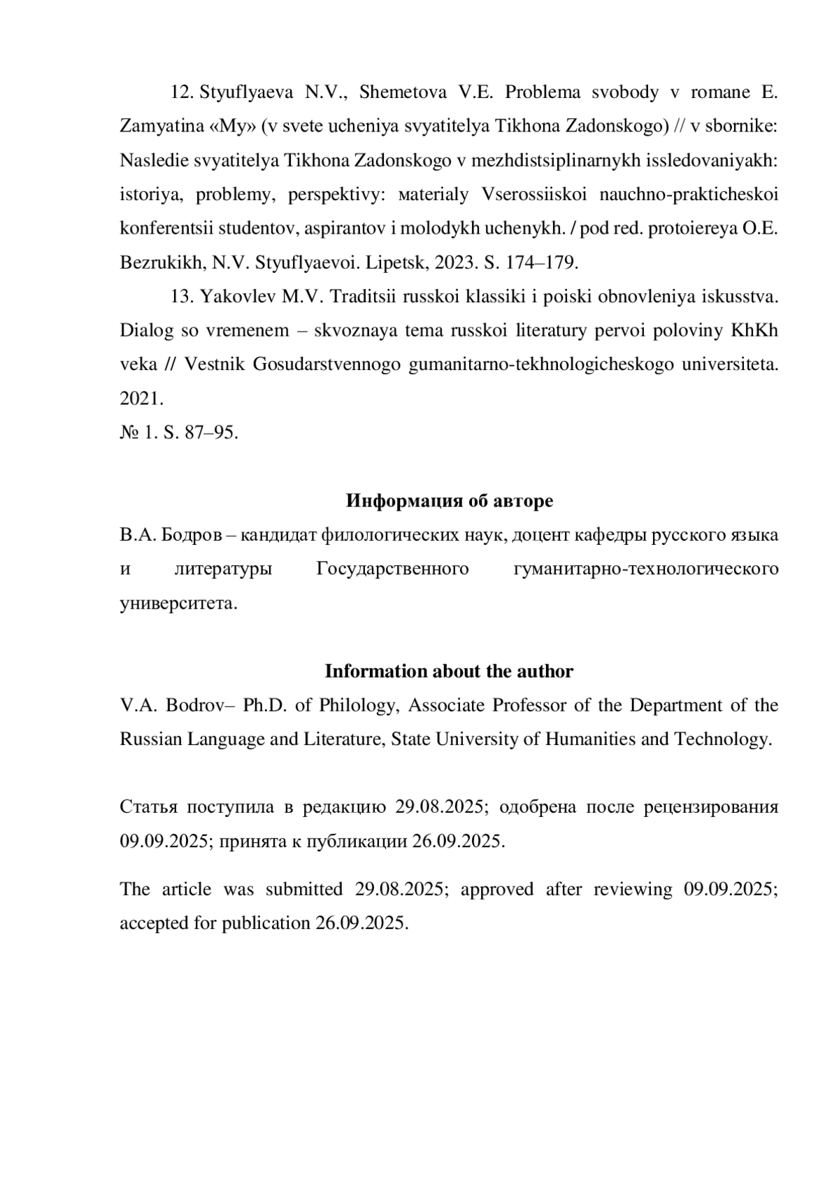 2. Бодров В.А. Критика Русского зарубежья 1950 - 1960-х годов о “Лицах” Е.И. Замятина // Вестник Государственного гуманитарно-технологического университета. 2025. № 1. С. 198-203. EDN: CBWXDQ