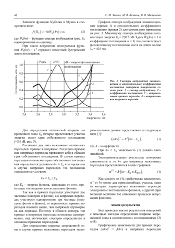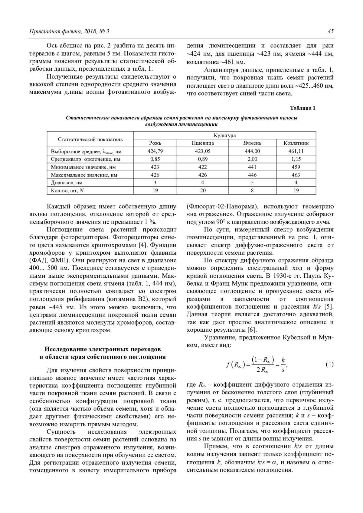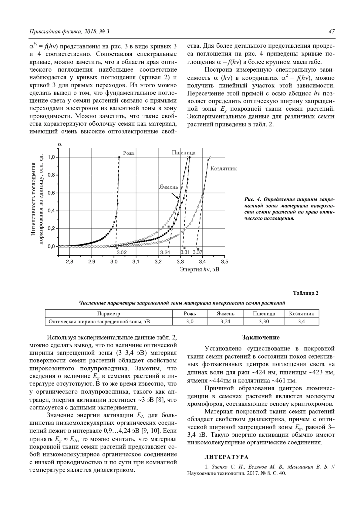 Статья посвящена исследованию электронных свойств материала покровной ткани семян растений: ржи, пшеницы, ячменя и козлятника при комнатной температуре. Обнаружено существование в покровной ткани семян растений в состоянии покоя селективных фотоактивных центров поглощения света на длинах волн для ржи 424 нм, пшеницы 423 нм, ячменя 444 нм и козлятника 461 нм, что соответствует синей части света. По спектру диффузного отражения поверхности семян растений определяли спектральный ход и форму кривой поглощения. Для описания хода изменения коэффициента поглощения использовали уравнение Кубелки и Мунка. В результате по краю оптического поглощения рассчитана оптическая ширина запрещенной зоны, которая в зависимости от типа семени изменяется от 3 до 3,4 эВ. Из чего можно заключить, что материал покровной ткани семян растений проявляет свойства широкозонного полупроводника.