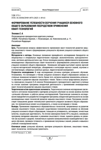 Методология и методы. Основные положения проведённого исследования базируются на общенаучных и специальных педагогических подходах: аксиологическом, культурологическом, системно-деятельностном и др. Статья посвящена анализу эффективности применения инновационных образовательных квант-технологий в формировании успешности обучения учащихся основного общего образования. Основными методами выступают анализ научной и научно-методической литературы, объединение и интеграция научных знаний, изучение и систематизация, собранных анкетных данных, педагогический эксперимент.