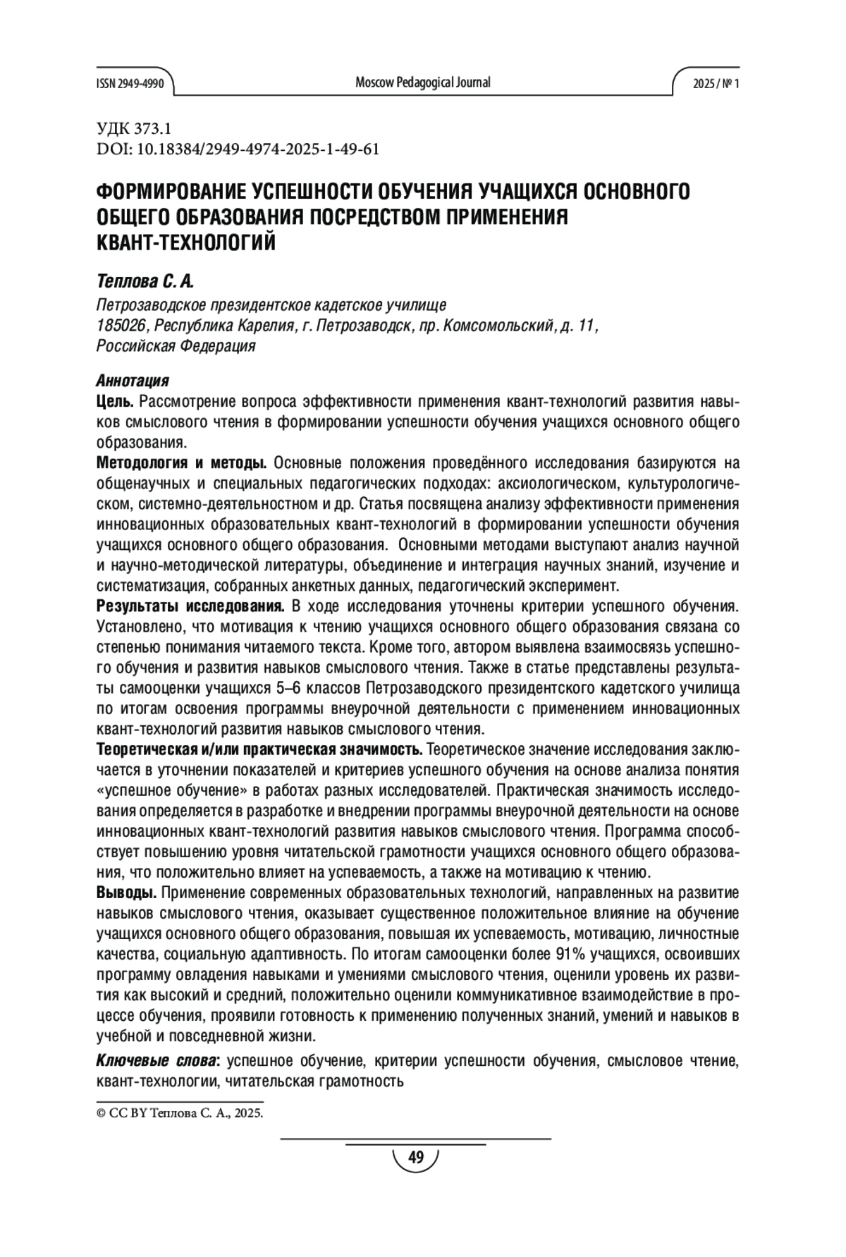 Теоретическая и/или практическая значимость. Теоретическое значение исследования заключается в уточнении показателей и критериев успешного обучения на основе анализа понятия «успешное обучение» в работах разных исследователей. Практическая значимость исследования определяется в разработке и внедрении программы внеурочной деятельности на основе инновационных квант-технологий развития навыков смыслового чтения. Программа способствует повышению уровня читательской грамотности учащихся основного общего образования, что положительно влияет на успеваемость, а также на мотивацию к чтению.