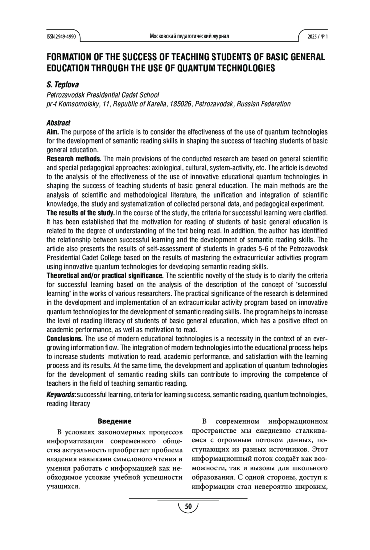 Цель. Рассмотрение вопроса эффективности применения квант-технологий развития навыков смыслового чтения в формировании успешности обучения учащихся основного общего образования.
