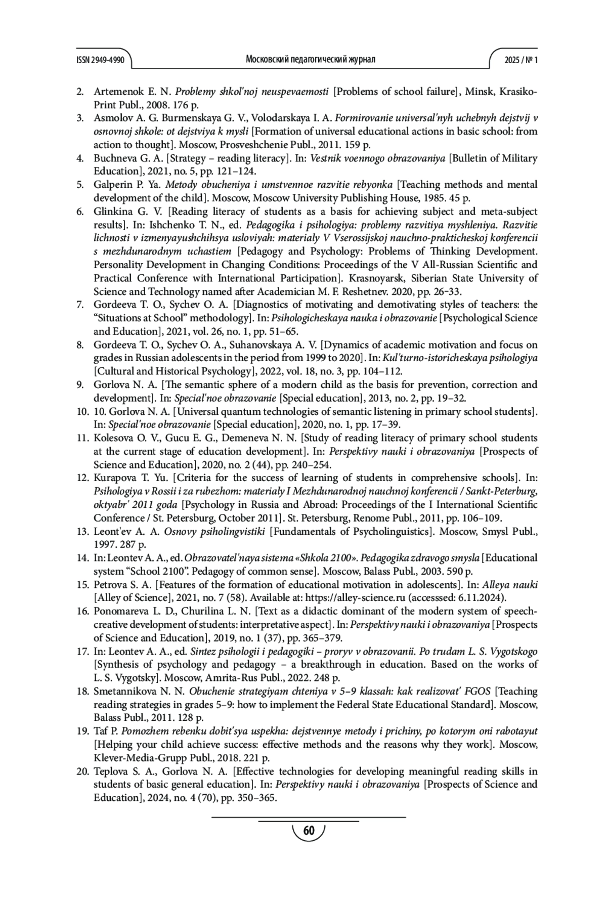 20. Теплова С. А., Горлова Н. А. Эффективные технологии развития навыков смыслового чтения у обучающихся основного общего образования // Перспективы науки и образования. 2024. №4 (70). С. 350-365. EDN: RRBQZY