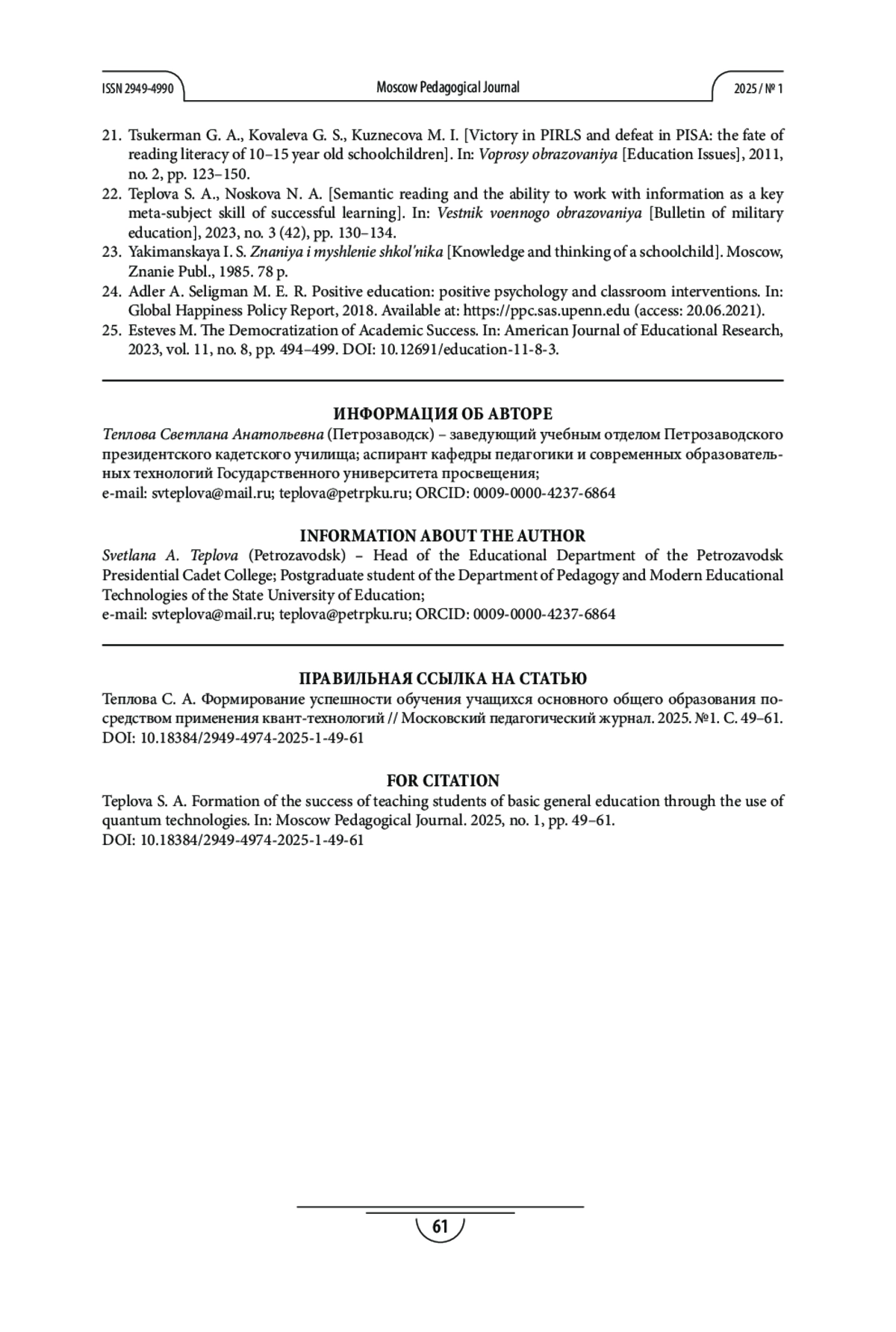 25. Esteves M. The Democratization of Academic Success // American Journal of Educational Research. 2023. Vol. 11. №8. P. 494-499. DOI: 10.12691/education-11-8-3 EDN: YVZZCT