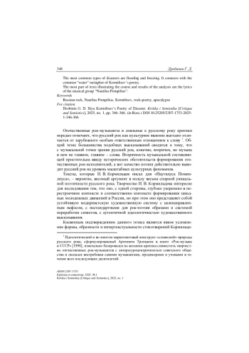 Наиболее распространенными типами бедствий в поэзии Кормильцева оказываются наводнение и замерзание, что связано с системной для творчества Кормильцева метафорой воды как квинтэссенции жизни.