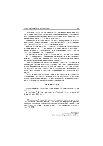 Рассматриваются романы Владимира Сорокина периода соц-арта («Норма», «Тридцатая любовь Марины», «Роман», «Сердца четырех», «Голубое сало») в аспекте функционирования в наррации данных произведений постсоветского дискурса, под которым понимается идеологически принятая и поэтически выстроенная автором нарративная стратегия деконструкции советского. Спектр нарративных форм данных романов очень широк: здесь и разработанные инстанции абстрактного и конкретного нарратора, сопряженные с точкой зрения ключевого персонажа в сюжетной структуре произведения, и вставные новеллы и иные короткие повествования вплоть до нарративных миниатюр, как в «Норме», и прямая нарративная речь в жанрах личного письма и дневника, и многое другое. Собственно постсоветский дискурс затрагивает преимущественно инстанцию абстрактного нарратора, реже – конкретного. Принципиальная особенность нарративной стратегии постсоветского дискурса в версии Сорокина заключается в целенаправленной и, более того, тотальной критике (вплоть до уничтожения) советской классичности как таковой во всех аспектах ее представления в произведениях автора как в диегезисе, так и собственно в дискурсном плане и, в итоге, в аспекте распада самого языка советской эпохи.