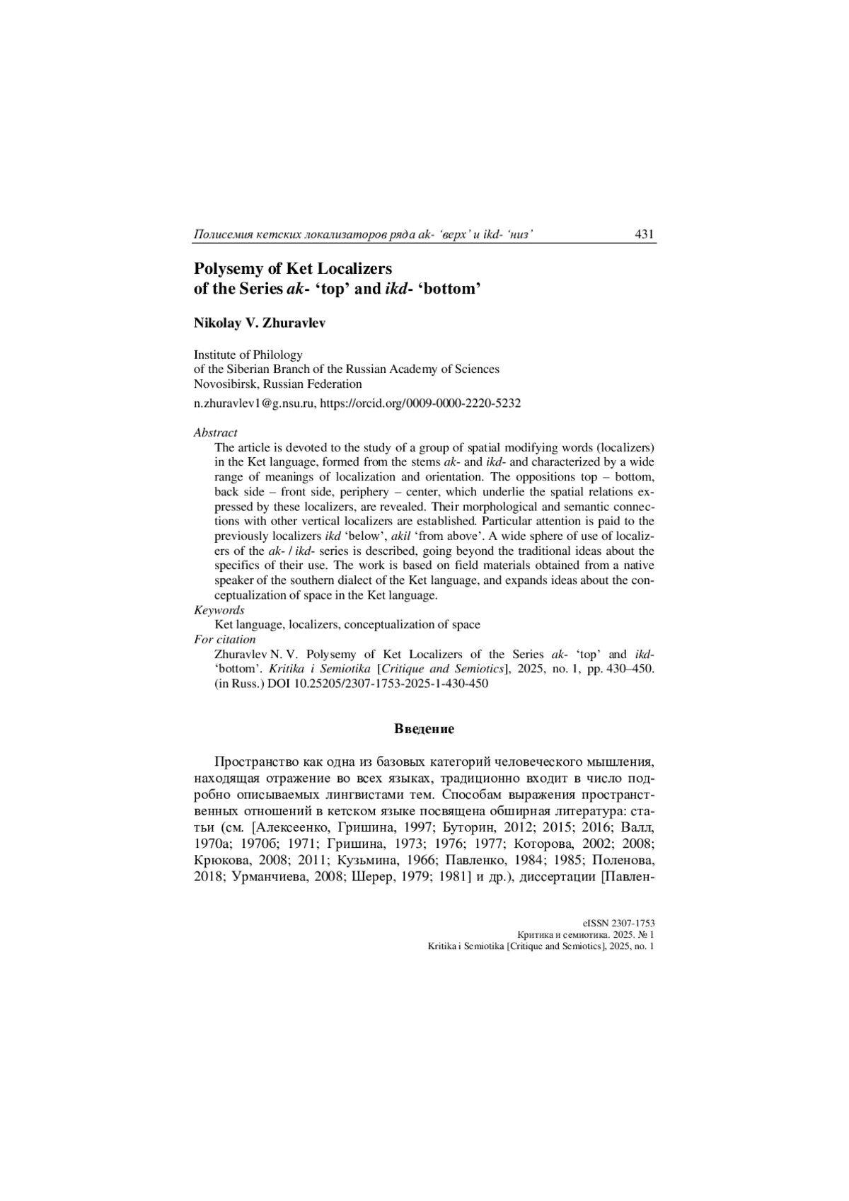 Рассматривается группа пространственных слов-определителей, образованных от основ ak-, ikd- и характеризующихся широким спектром значений локализации и ориентации. Выявляются оппозиции верх - низ, задняя сторона - передняя сторона, периферия - центр, лежащие в основе пространственных отношений, выражаемых данными локализаторами. Устанавливаются их морфологические и семантические связи с другими вертикальными локализаторами. В научный оборот вводится новый лексический материал: локализаторы ikd ‘внизу’, akil ‘сверху’, не зафиксированные в известных нам словарях и описаниях средств выражения пространственных отношений в кетском языке.