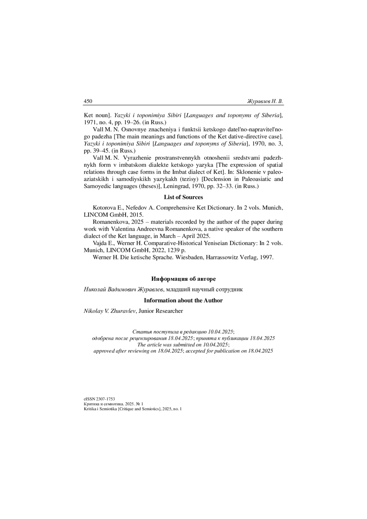 6. Буторин С. С. Об основных средствах кодирования локационных и директивных семантических компонентов в кетском языке // Языки и фольклор коренных народов Сибири. 2016. № 1 (30). С. 84-96.