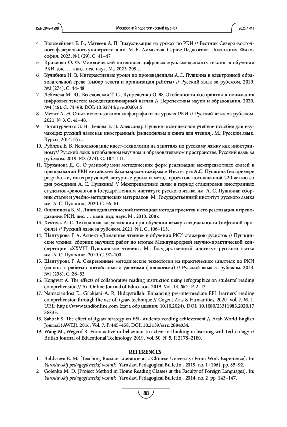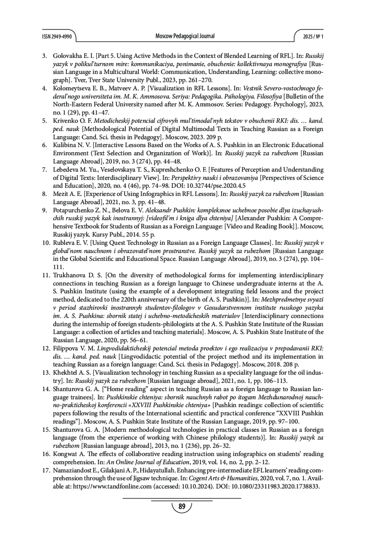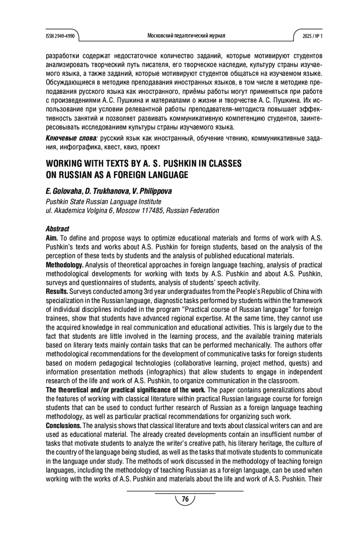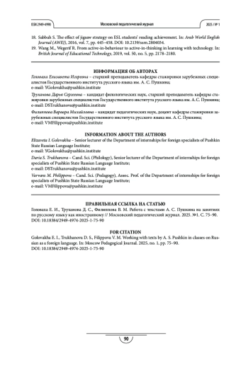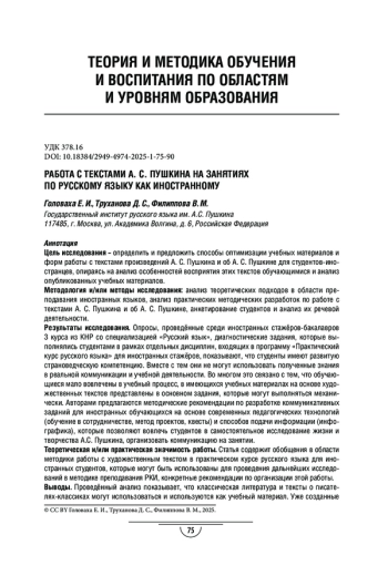 ГОЛОВАХА Е. И., ТРУХАНОВА Д. С., ФИЛИППОВА В. М. РАБОТА С ТЕКСТАМИ А. С. ПУШКИНА НА ЗАНЯТИЯХ ПО РУССКОМУ ЯЗЫКУ КАК ИНОСТРАННОМУ // МОСКОВСКИЙ ПЕДАГОГИЧЕСКИЙ ЖУРНАЛ. 2025. № 1