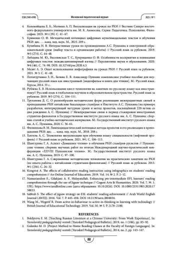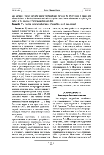 Выводы. Проведённый анализ показывает, что классическая литература и тексты о писателях-классиках могут использоваться и используются как учебный материал. Уже созданные разработки содержат недостаточное количество заданий, которые мотивируют студентов анализировать творческий путь писателя, его творческое наследие, культуру страны изучаемого языка, а также заданий, которые мотивируют студентов общаться на изучаемом языке. Обсуждающиеся в методике преподавания иностранных языков, в том числе в методике преподавания русского языка как иностранного, приёмы работы могут применяться при работе с произведениями А. С. Пушкина и материалами о жизни и творчестве А. С. Пушкина. Их использование при условии релевантной работы преподавателя-методиста повышает эффективность занятий и позволяет развивать коммуникативную компетенцию студентов, заинтересовывать исследованием культуры страны изучаемого языка.