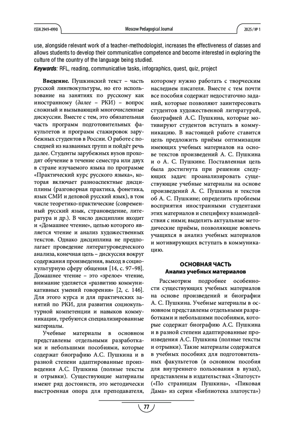 Ключевые фразы: РУССКИЙ ЯЗЫК КАК ИНОСТРАННЫЙ, обучение чтению, коммуникативные задания, инфографика, квест, квиз, проект
