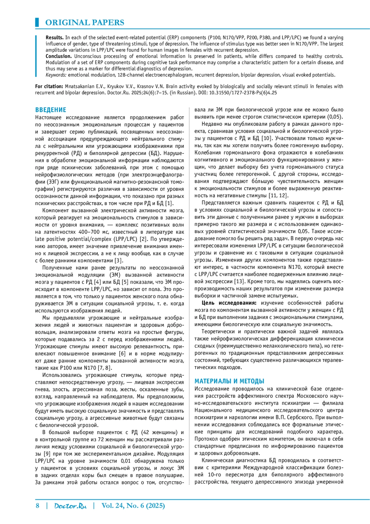 4. Мнацаканян E.B., Крюков В.В., Краснов В.Н. Еендерные различия эмоциональной модуляции зрительных ответов мозга у пациентов с рекуррентной депрессией. Докгор.Ру. 2020;19(9): 77-82.