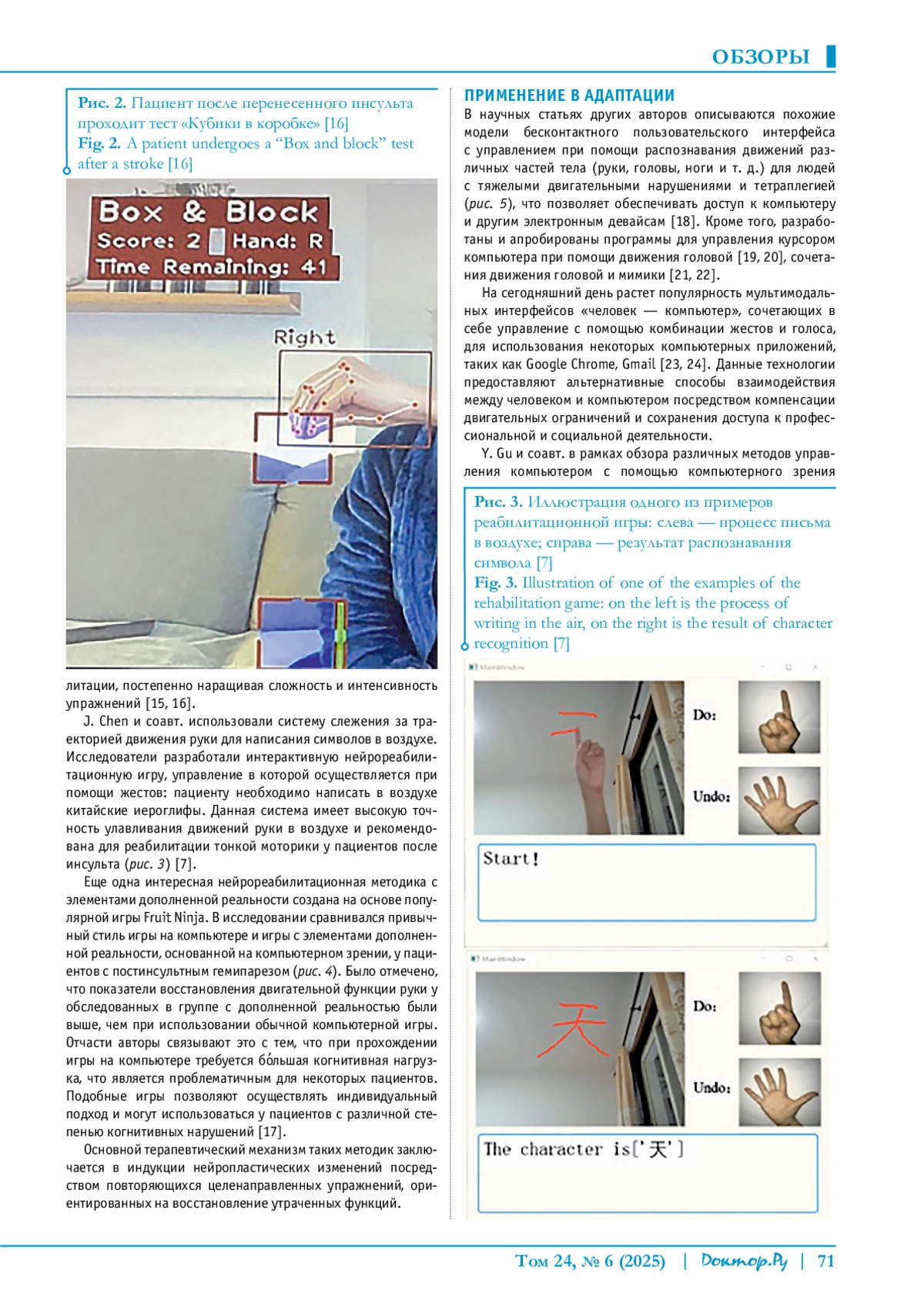 Сервисы с применением компьютерных технологий и нейронных сетей в медицине, в том числе в области реабилитации, развиваются с невероятной скоростью [1–3]. На сегодняшний день векторами совершенствования этих технологий прежде всего являются повышение доступности медицинской реабилитации, а также развитие возможностей интеграции процесса восстановления с повседневной активностью пациента [1].
