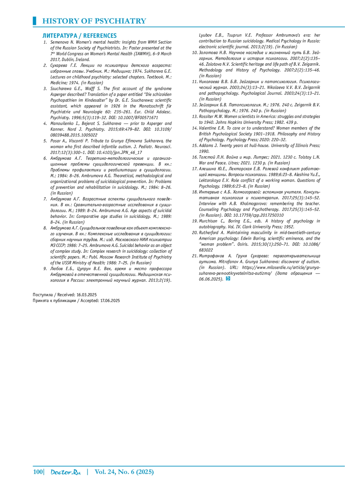 4. Manouilenko I., Bejerot S. Sukhareva - prior to Asperger and Kanner. Nord J. Psychiatry. 2015;69:479-82. 10.3109/ 08039488.2015.1005022. DOI: 10.3109/08039488.2015.1005022