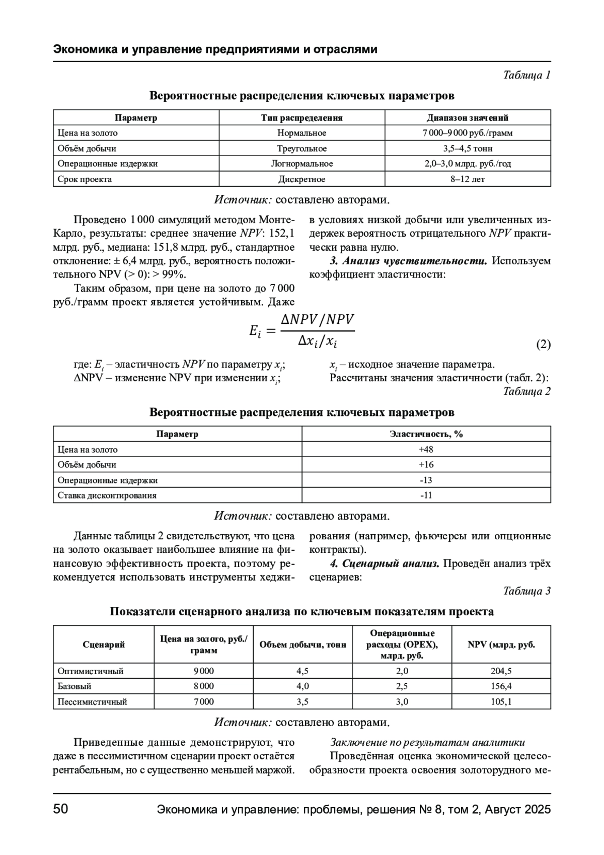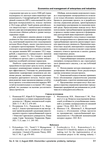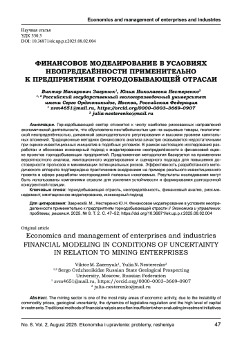 Горнодобывающий сектор относится к числу наиболее рискованных направлений экономической деятельности, что обусловлено нестабильностью цен на сырьевые товары, геологической неопределённостью, динамикой законодательного регулирования и высоким уровнем капитальных вложений. Традиционные методики финансового анализа зачастую оказываются недостаточными при оценке инвестиционных инициатив в подобных условиях. В рамках настоящего исследования разработан и обоснован инженерный подход к моделированию неопределённости в финансовой оценке проектов горнодобывающих предприятий. Предложенная методология базируется на применении вероятностного анализа, имитационного моделирования и сценарного подхода для повышения достоверности прогнозов и минимизации потенциальных рисков. Эффективность разработанного методического аппарата подтверждена практическим внедрением на примере реального инвестиционного проекта в сфере разработки месторождений полезных ископаемых. Результаты исследования могут быть использованы компаниями отрасли для усиления устойчивости и формирования долгосрочной конкурентной позиции.