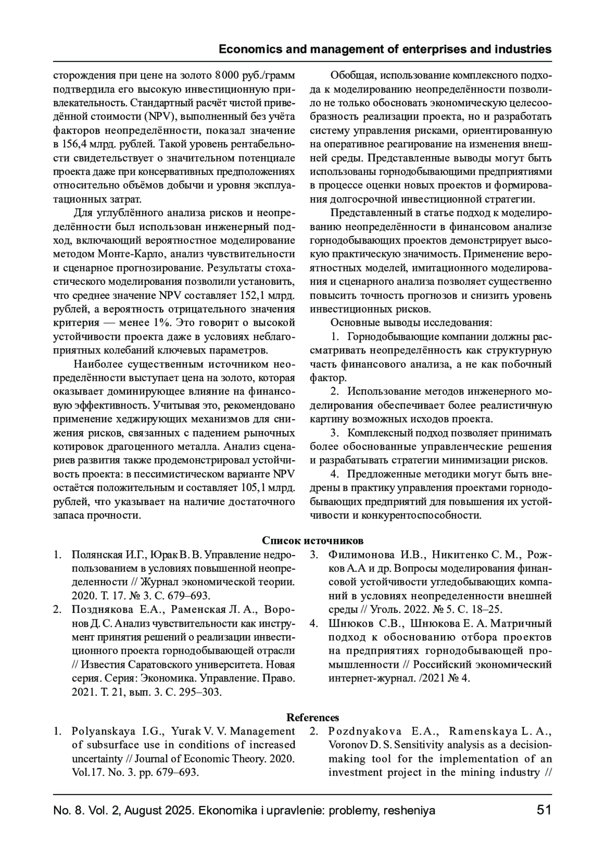 1. Полянская И.Г., Юрак В. В. Управление недропользованием в условиях повышенной неопределенности // Журнал экономической теории. 2020. Т. 17. № 3. С. 679-693. EDN: RVLEFU