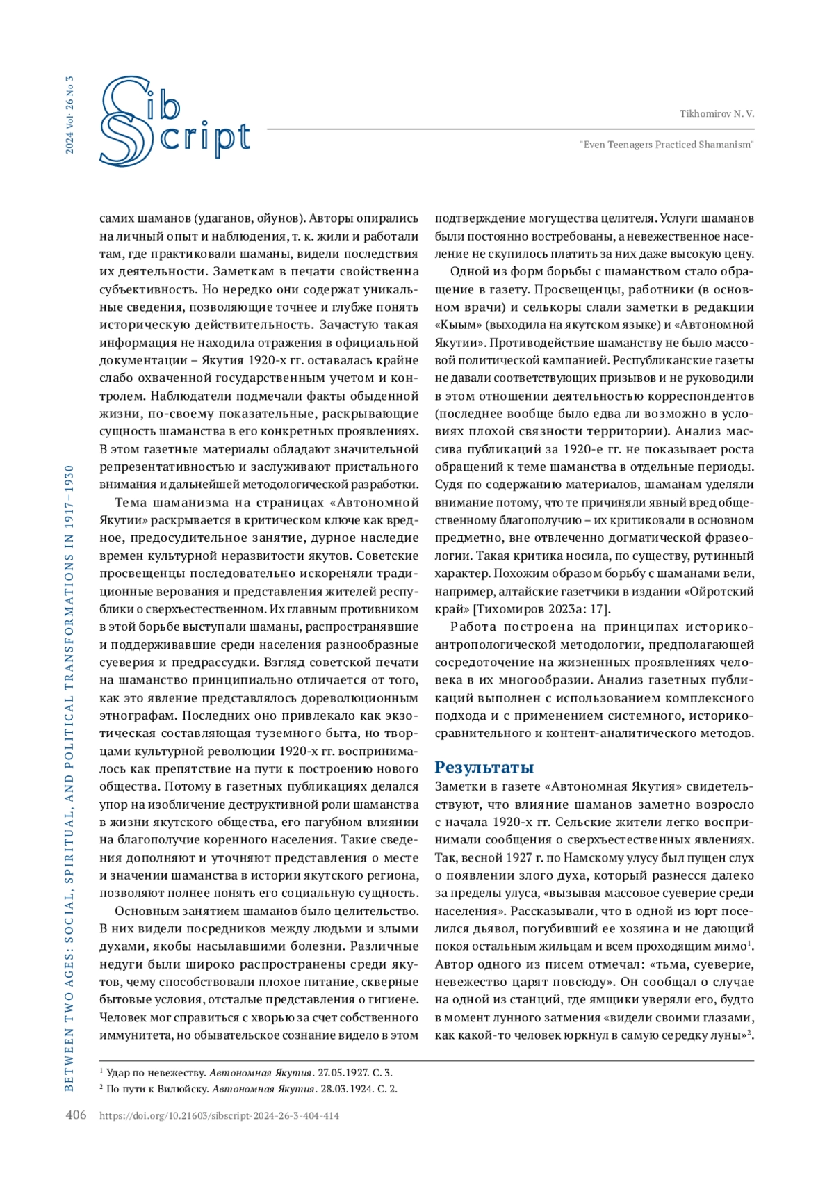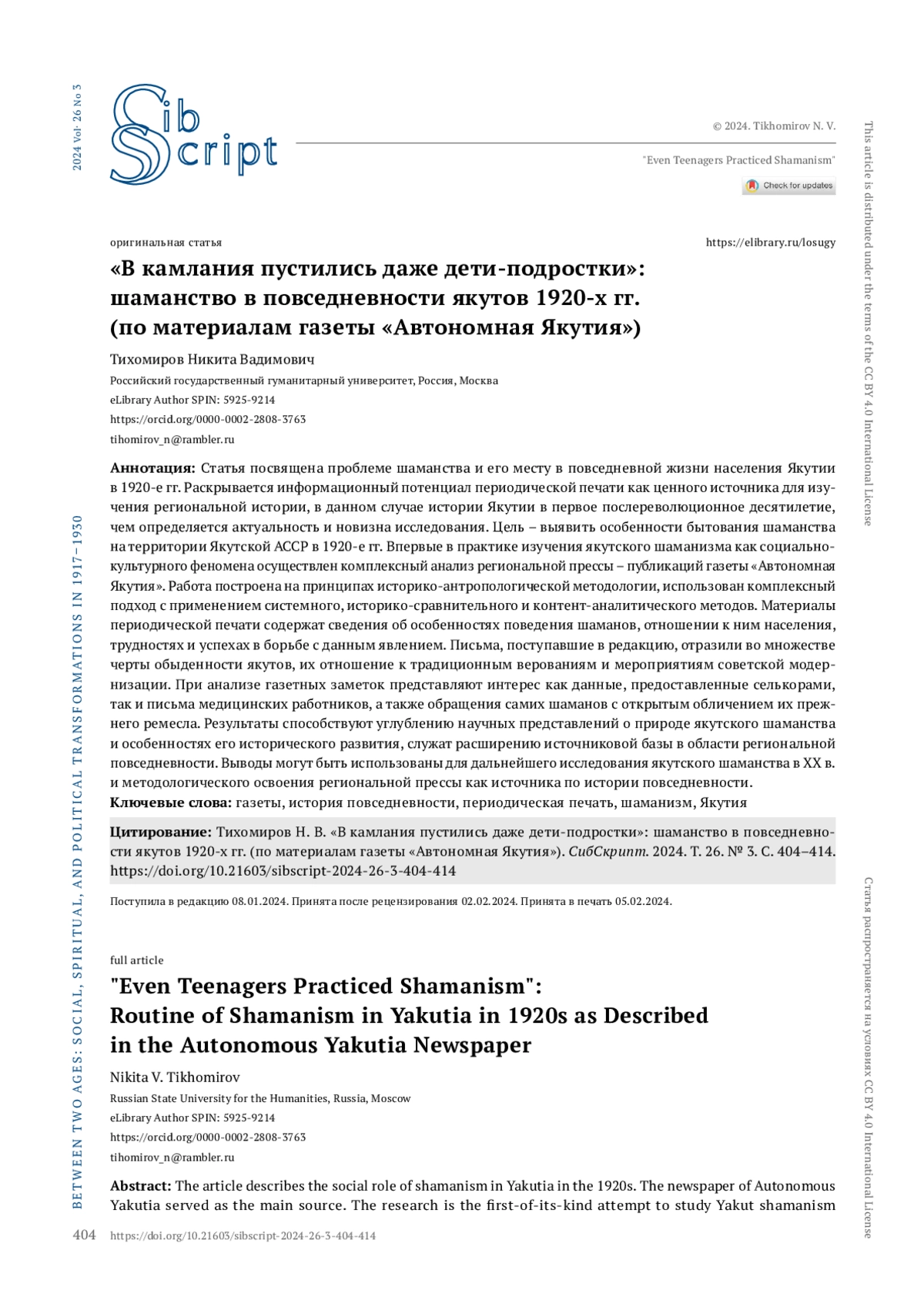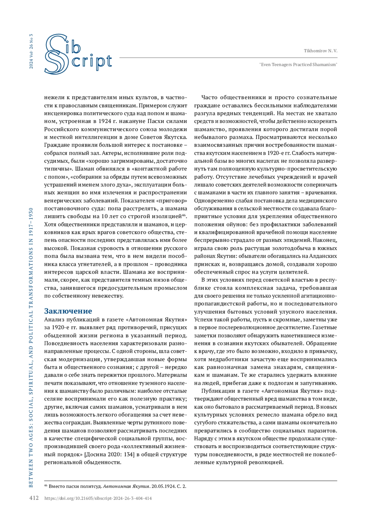 Статья посвящена проблеме шаманства и его месту в повседневной жизни населения Якутии в 1920-е гг. Раскрывается информационный потенциал периодической печати как ценного источника для изучения региональной истории, в данном случае истории Якутии в первое послереволюционное десятилетие, чем определяется актуальность и новизна исследования. Цель – выявить особенности бытования шаманства на территории Якутской АССР в 1920-е гг. Впервые в практике изучения якутского шаманизма как социально-культурного феномена осуществлен комплексный анализ региональной прессы – публикаций газеты «Автономная Якутия». Работа построена на принципах историко-антропологической методологии, использован комплексный подход с применением системного, историко-сравнительного и контент-аналитического методов. Материалы периодической печати содержат сведения об особенностях поведения шаманов, отношении к ним населения, трудностях и успехах в борьбе с данным явлением. Письма, поступавшие в редакцию, отразили во множестве черты обыденности якутов, их отношение к традиционным верованиям и мероприятиям советской модернизации. При анализе газетных заметок представляют интерес как данные, предоставленные селькорами, так и письма медицинских работников, а также обращения самих шаманов с открытым обличением их прежнего ремесла. Результаты способствуют углублению научных представлений о природе якутского шаманства и особенностях его исторического развития, служат расширению источниковой базы в области региональной повседневности. Выводы могут быть использованы для дальнейшего исследования якутского шаманства в ХХ в. и методологического освоения региональной прессы как источника по истории повседневности.