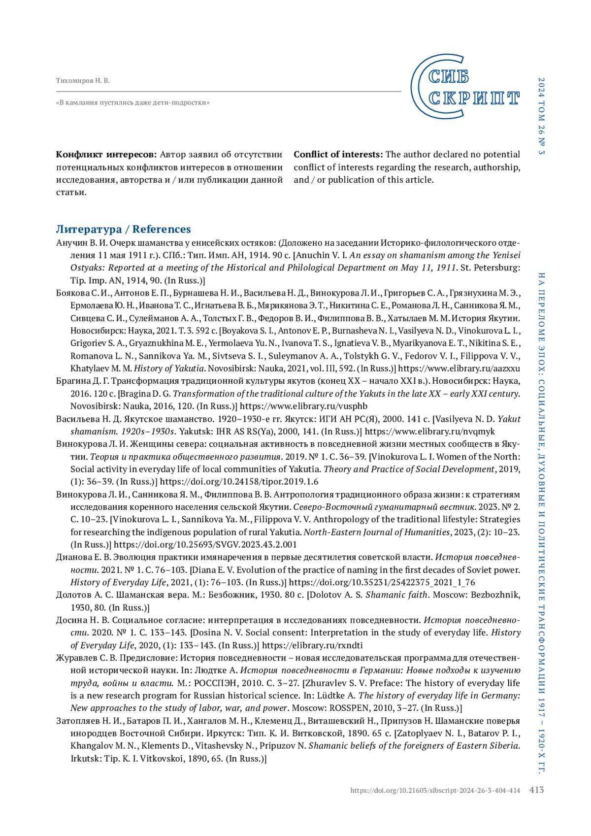 6. Винокурова Л. И., Санникова Я. М., Филиппова В. В. Антропология традиционного образа жизни: к стратегиям исследования коренного населения сельской Якутии. Северо-Восточный гуманитарный вестник. 2023. № 2. С. 10-23. https://doi.org/10.25693/SVGV.2023.43.2.001