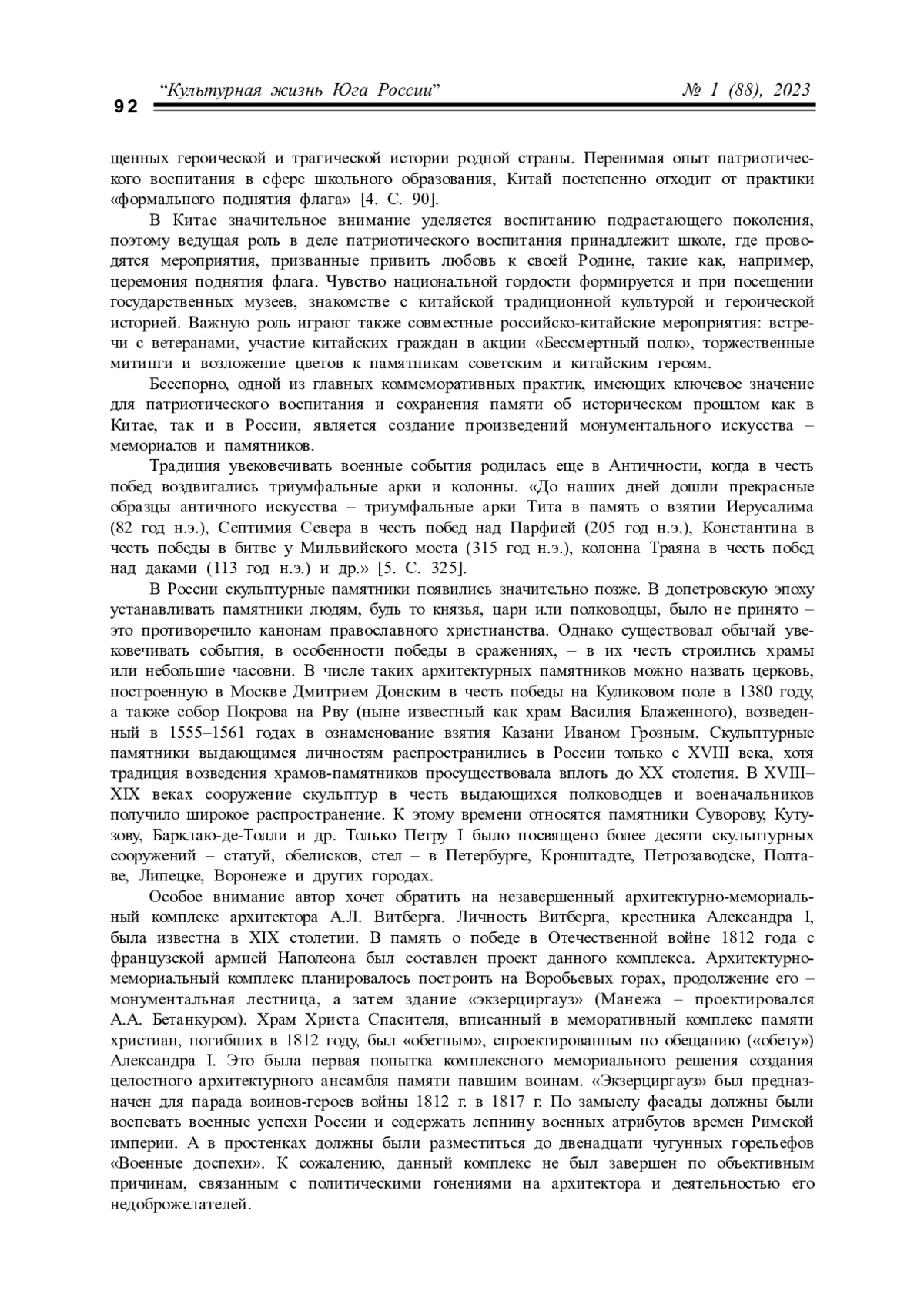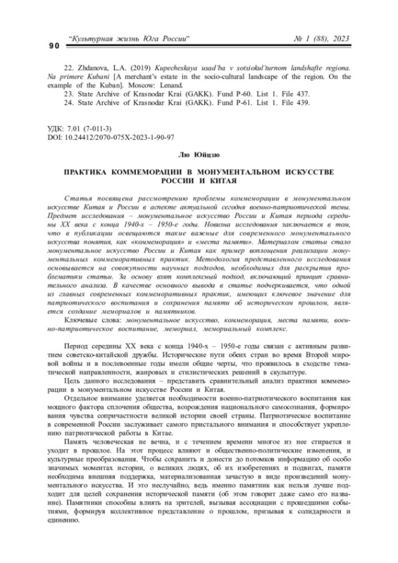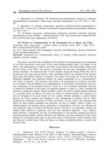 Статья посвящена рассмотрению проблемы коммеморации в монументальном искусстве Китая и России в аспекте актуальной сегодня военно-патриотической темы. Предмет исследования – монументальное искусство России и Китая периода середины ХХ века с конца 1940-х – 1950-е годы. Новизна исследования заключается в том, что в публикации освещаются такие важные для современного монументального искусства понятия, как «коммеморация» и «места памяти». Материалом статьи стало монументальное искусство России и Китая как пример воплощения реализации монументальных коммеморативных практик. Методология представленного исследования основывается на совокупности научных подходов, необходимых для раскрытия проблематики статьи. За основу взят комплексный подход, включающий принцип сравнительного анализа. В качестве основного вывода в статье подчеркивается, что одной из главных современных коммеморативных практик, имеющих ключевое значение для патриотического воспитания и сохранения памяти об историческом прошлом, является создание мемориалов и памятников