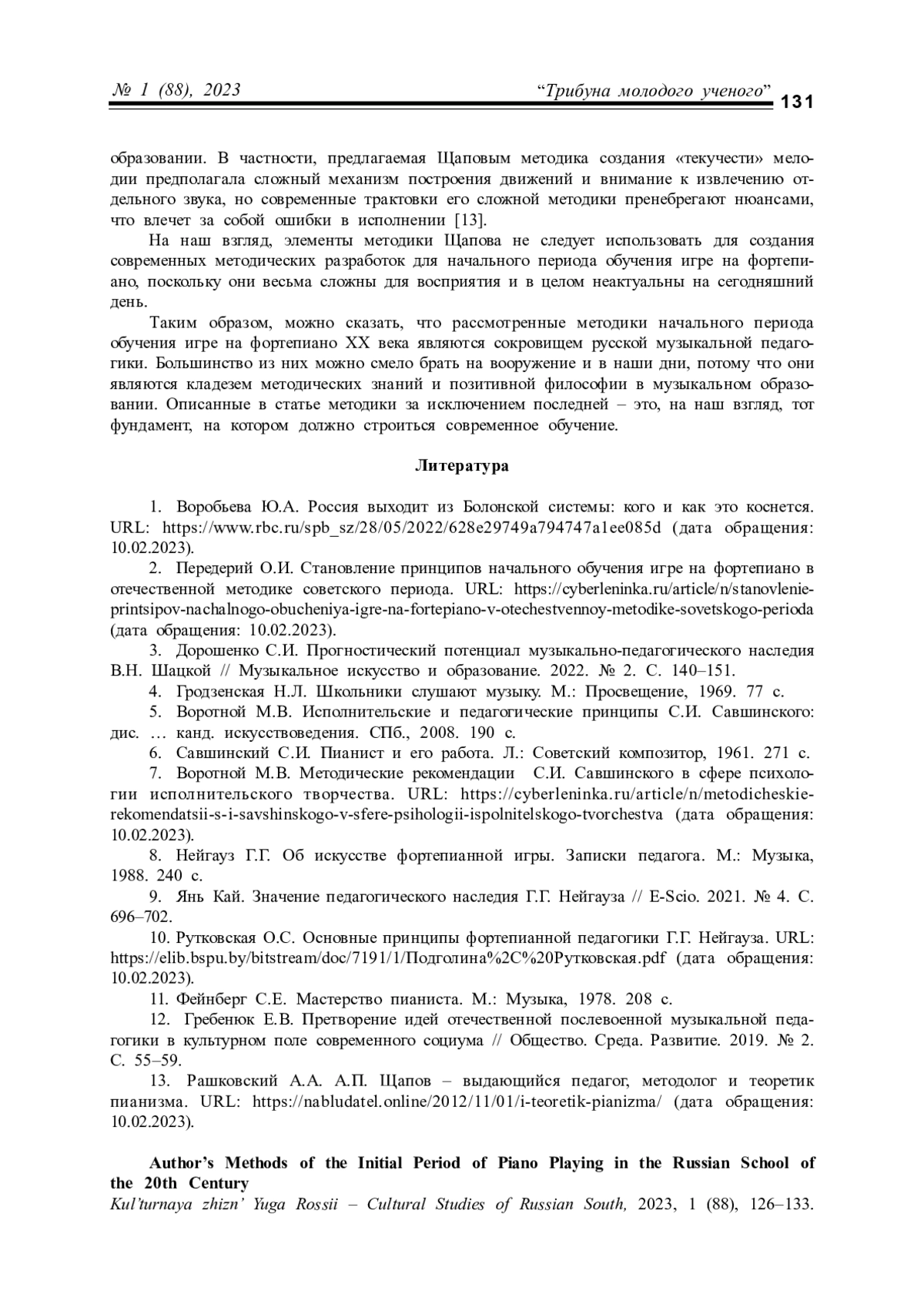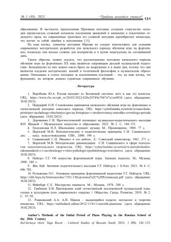 Статья: АВТОРСКИЕ МЕТОДИКИ НАЧАЛЬНОГО ПЕРИОДА ОБУЧЕНИЯ ИГРЕ НА ФОРТЕПИАНО РУССКОЙ ШКОЛЫ ХХ ВЕКА (2023)