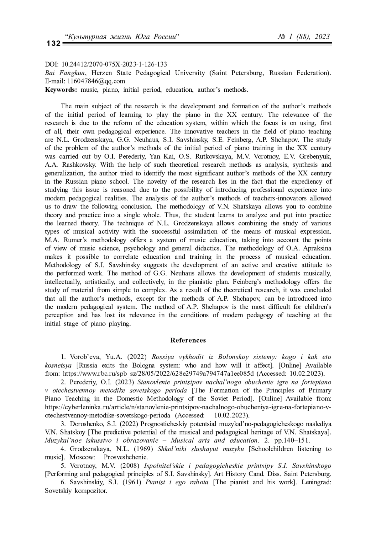 БАЙ Ф. АВТОРСКИЕ МЕТОДИКИ НАЧАЛЬНОГО ПЕРИОДА ОБУЧЕНИЯ ИГРЕ НА ФОРТЕПИАНО РУССКОЙ ШКОЛЫ ХХ ВЕКА // КУЛЬТУРНАЯ ЖИЗНЬ ЮГА РОССИИ. 2023. № 1 (88)