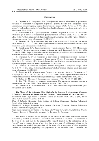 БАБЕНКО Е. В., НИСКОГУЗ Е. З. МУЗЫКА АНИМАЦИОННОГО ФИЛЬМА "ЗОЛУШКА" РЕЖИССЕРА И. АКСЕНЧУКА, КОМПОЗИТОРА И. ЦВЕТКОВА: ОСОБЕННОСТИ ТЕМАТИЗМА И ТЕМБРОВЫХ ХАРАКТЕРИСТИК ПЕРСОНАЖЕЙ // КУЛЬТУРНАЯ ЖИЗНЬ ЮГА РОССИИ. 2023. № 2 (89)