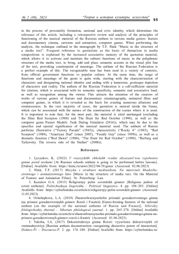 Ключевые фразы: МЕДИАТЕКСТ, цитата, функции музыки, художественное кино, ДОКУМЕНТАЛЬНОЕ КИНО, МУЛЬТФИЛЬМ, КОМПЬЮТЕРНАЯ ИГРА, гимн россии, гимн ссср