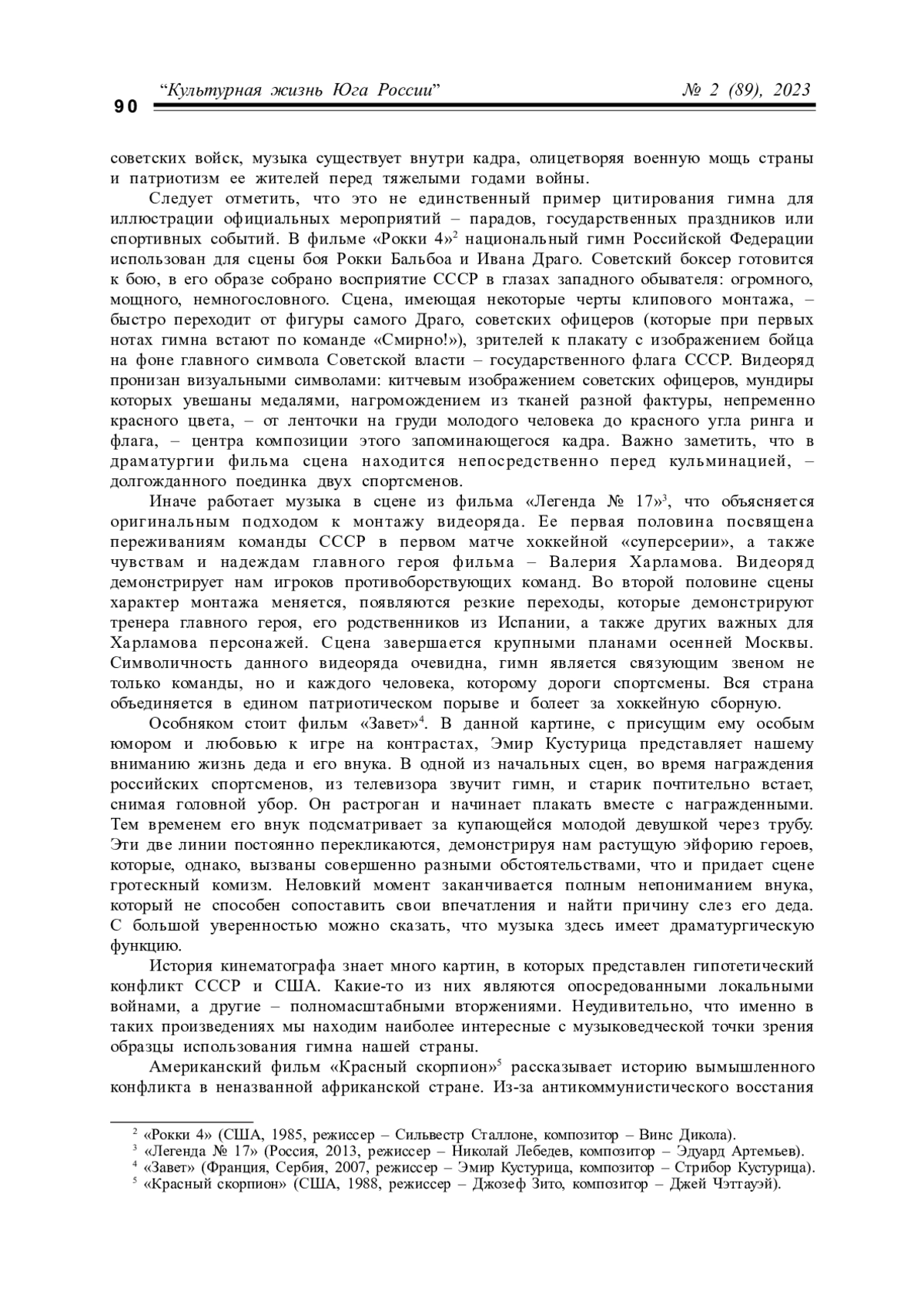 КРЕМЕНЕНКО А. С. ПОЛИФУНКЦИОНАЛЬНОСТЬ МУЗЫКАЛЬНОГО МАТЕРИАЛА ЦИТАТЫ В МЕДИАЖАНРАХ // КУЛЬТУРНАЯ ЖИЗНЬ ЮГА РОССИИ. 2023. № 2 (89)