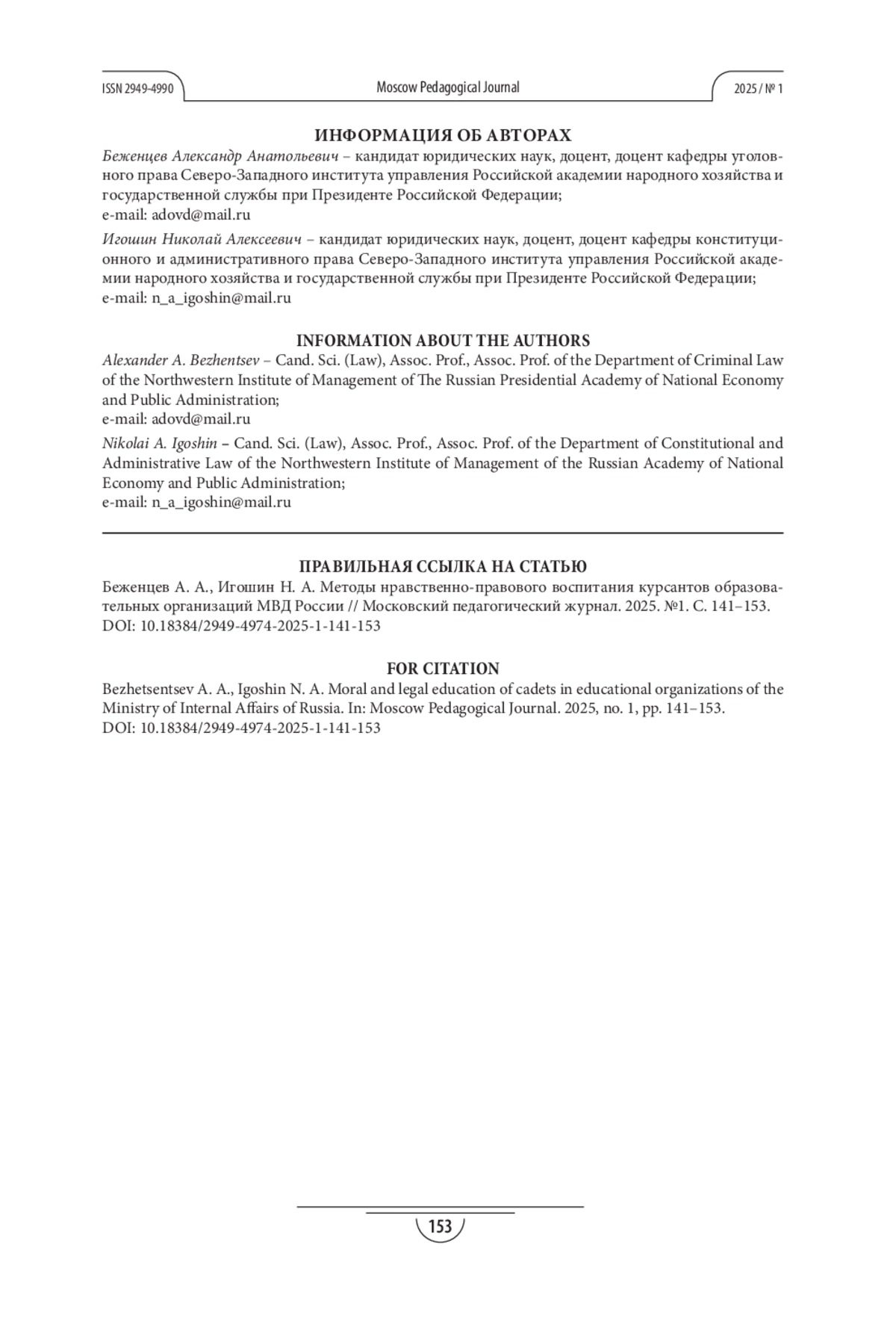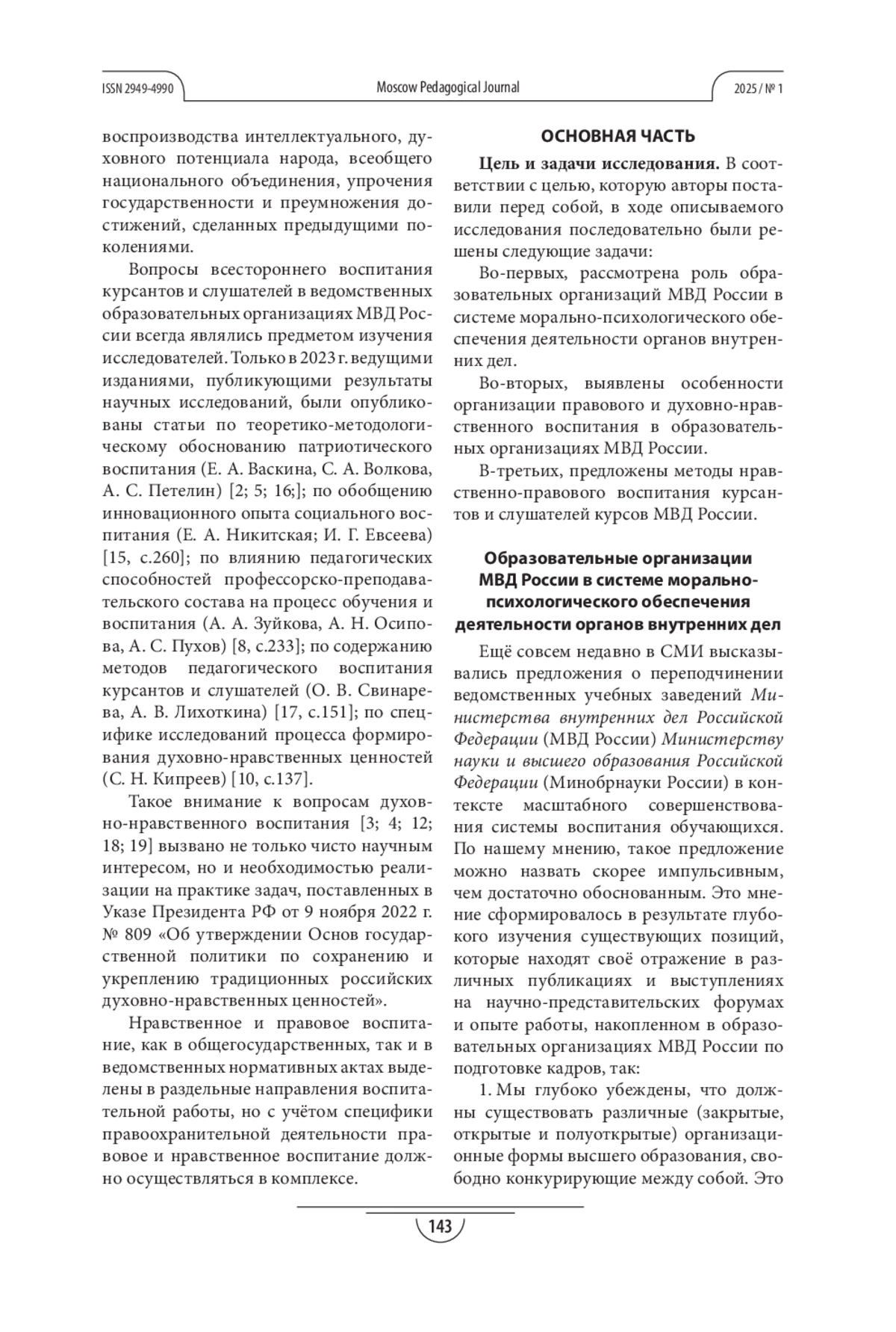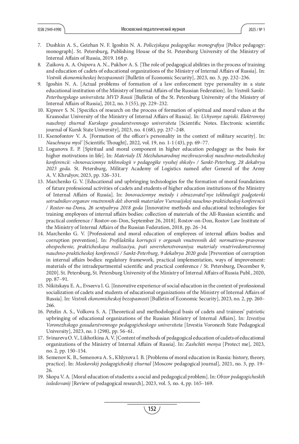 15. Никитская Е. А., Евсеева И.Г. Инновационный опыт осуществления социального воспитания в контексте профессиональной социализации курсантов и слушателей образовательных организаций МВД России // Вестник экономической безопасности. 2023. №2. С. 260-266. EDN: XHAGZJ