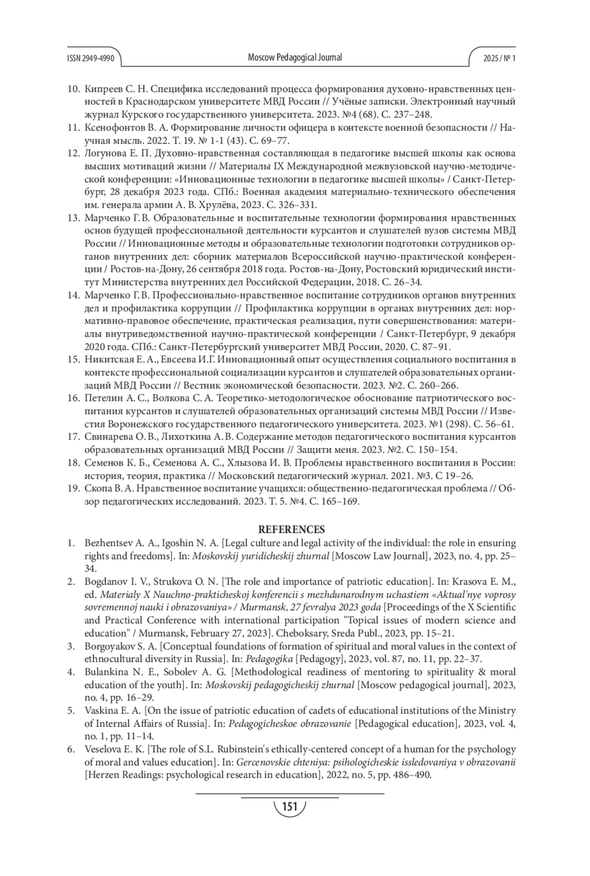 10. Кипреев С. Н. Специфика исследований процесса формирования духовно-нравственных ценностей в Краснодарском университете МВД России // Учёные записки. Электронный научный журнал Курского государственного университета. 2023. №4 (68). С. 237-248. EDN: MGMJUT