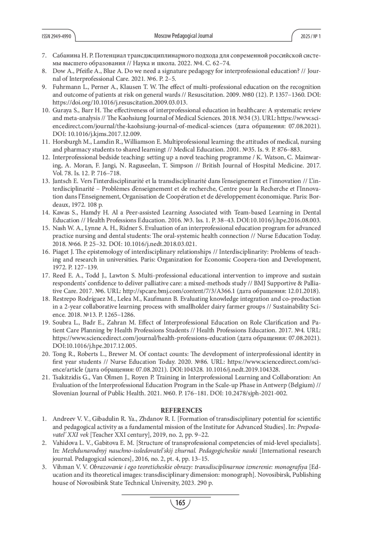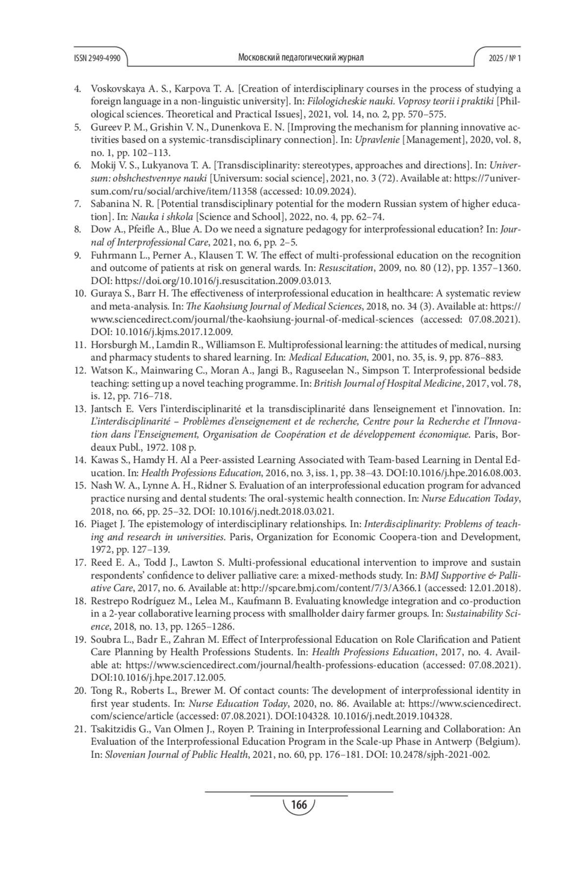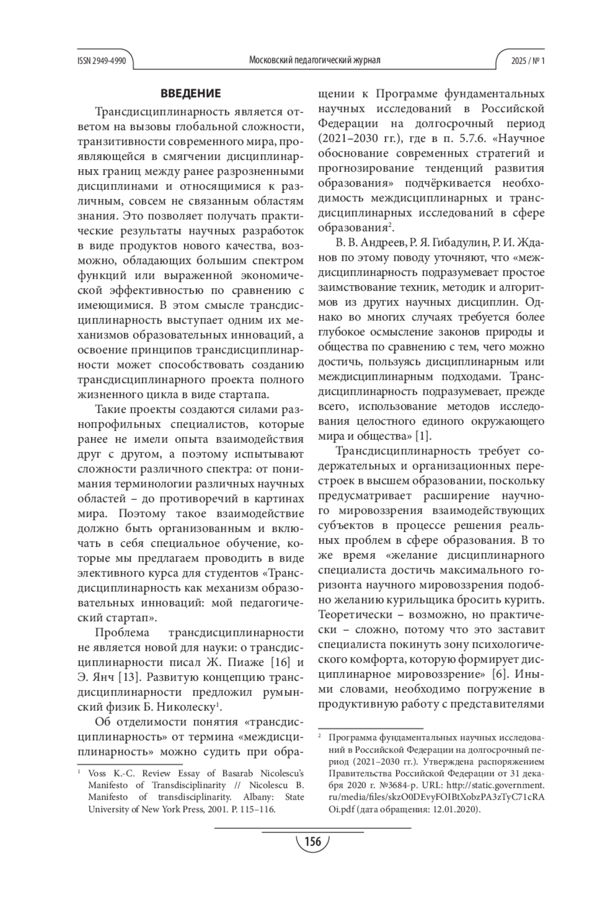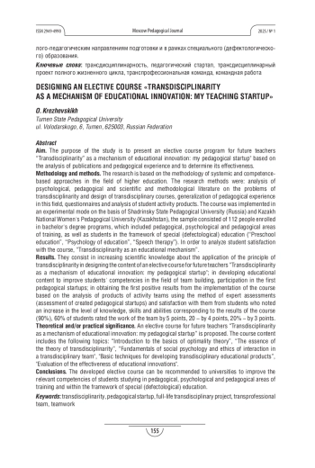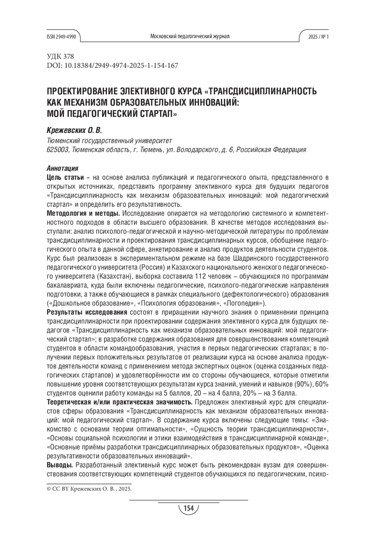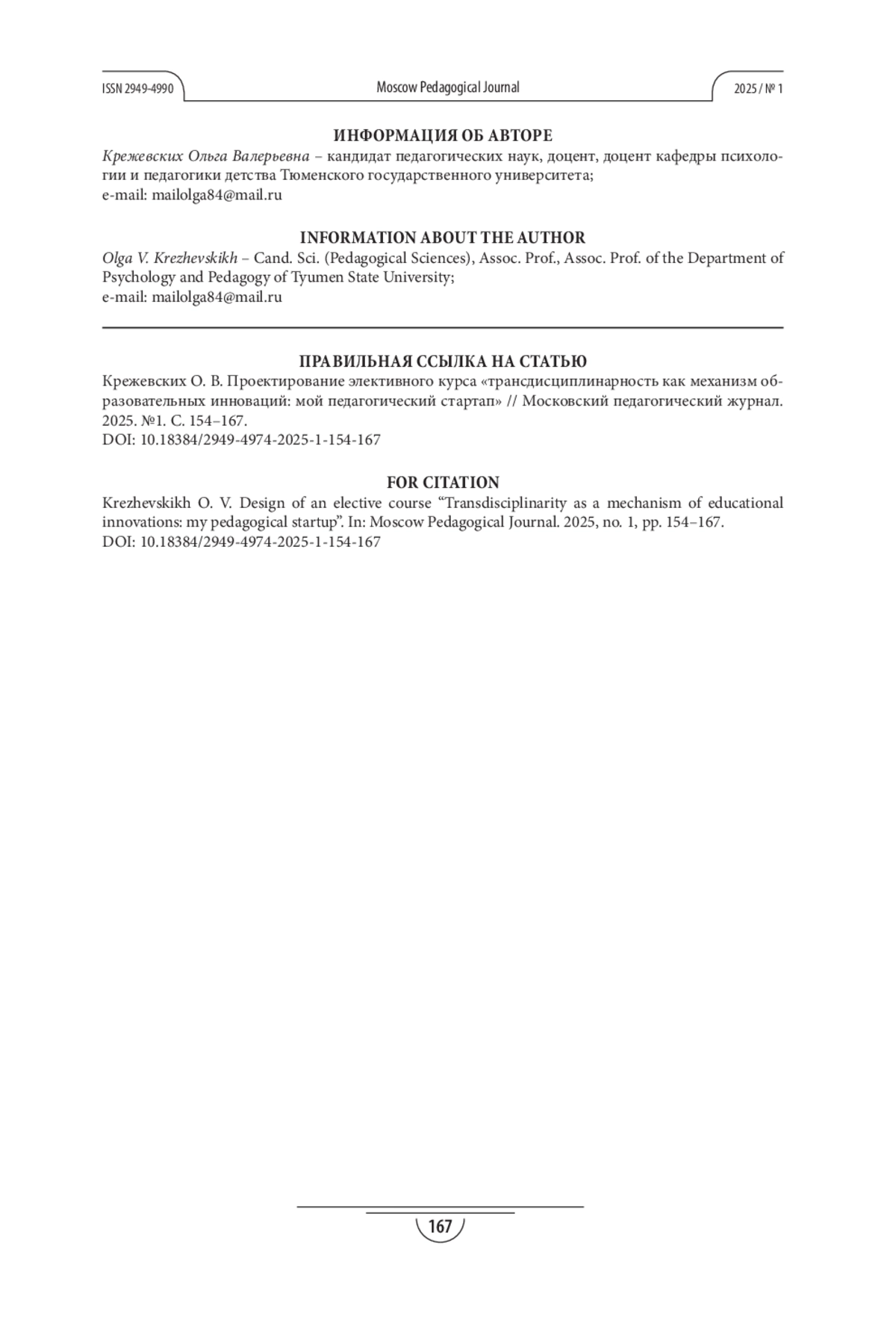 КРЕЖЕВСКИХ О. В. ПРОЕКТИРОВАНИЕ ЭЛЕКТИВНОГО КУРСА «ТРАНСДИСЦИПЛИНАРНОСТЬ КАК МЕХАНИЗМ ОБРАЗОВАТЕЛЬНЫХ ИННОВАЦИЙ: МОЙ ПЕДАГОГИЧЕСКИЙ СТАРТАП» // МОСКОВСКИЙ ПЕДАГОГИЧЕСКИЙ ЖУРНАЛ. 2025. № 1