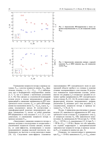 – Мощность потерь в проводе катушки, Рcoil, снижалась с увеличением мощности плазмы от 38 Вт (Рpl = 52 Вт) до 20 Вт (Рpl = 85 Вт), а затем возрастала до 47 Вт. КПД катушки индуктивности coil увеличивался от 58 % до 80 % (Рpl = 85 Вт), а на бóльших мощностях плазмы снижался до 70 %.