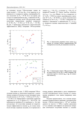 – Поток УФ-излучения плазмы на длине волны 254 нм, Ф254, возрастал монотонно во всем интервале исследуемых мощностей плазмы от 28 Вт до 72 Вт, а КПД генерации УФ-излучения плазмы, pl, незначительно увеличивался от 52 до 65 %. КПД генерации УФ-излучения лампы lamp возрастал от 32 до 48 % (Рpl = 83 Вт), а затем медленно уменьшался до 46 % (Рpl = 112 Вт).