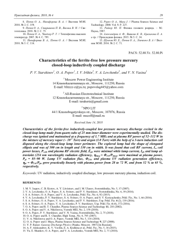 Старшинов П. В., Попов О. А., Ирхин И. В., Левченко В. А., Васина В. Н. Характеристики бесферритного индуктивного ртутного разряда низкого давления в замкну-той кварцевой трубке 24