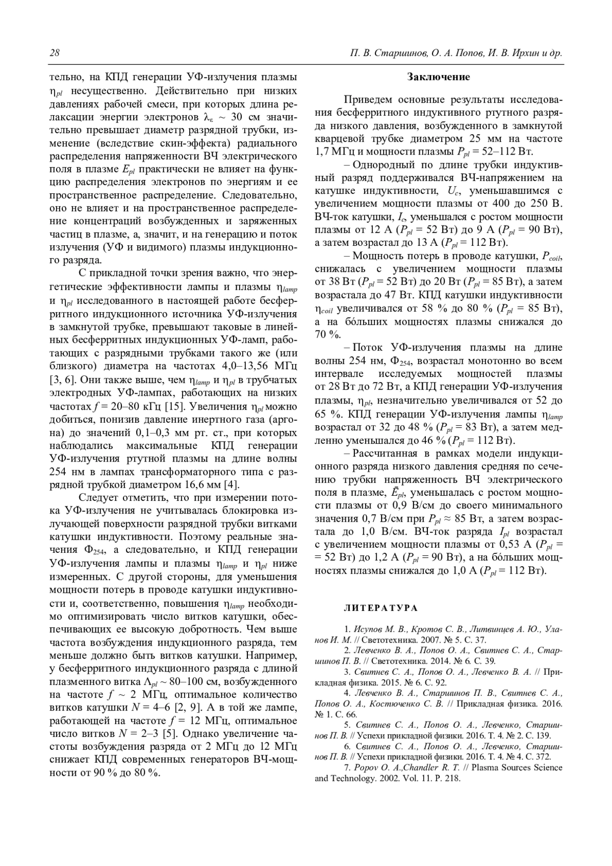 6. Свитнев С. А., Попов О. А., Левченко, Старшинов П. В. // Успехи прикладной физики. 2016. Т. 4. № 4. С. 372.