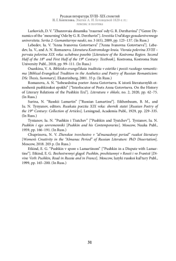 26. Ларкович Д. В. Жанровая динамика “траурной” оды Г. Р. Державина // Известия Уральского государственного университета. Серия 2: Гуманитарные науки. 2009. № 3 (65). С. 123-137. Лебедев Ю. В. Анна Ивановна Готовцева // Лебедев Ю. В., Романова А. Н. Литература Костромского края. Вторая половина XVIII - первая половина XIX века: учебное пособие. Кострома: КГУ, 2018. С. 99-111.