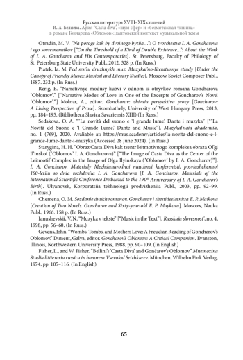 41. Fisher L., Fisher W. Bellini’s “Casta Diva” and Gončarov’s Oblomov //Mnemozina Studia littteraria russica in honorem Vsevolod Setchkarev. München: Wilhelm Fink Verlag, 1974. P. 105-116.