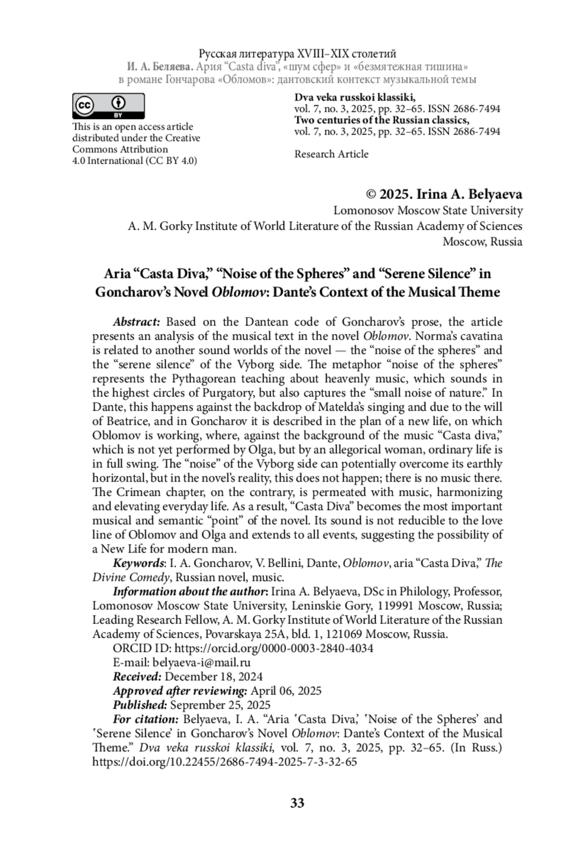 В статье представлен анализ музыкального текста в романе «Обломов», исходя из дантовского кода прозы Гончарова. Каватина Нормы соотнесена с другими звуковыми мирами романа — «шумом сфер» и «безмятежной тишиной» Выборгской стороны. Метафора «шум сфер» репрезентирует пифагорейское учение о небесной музыке, которая звучит в высших кругах Чистилища, но захватывает и «мелкий шум природы». У Данте это происходит на фоне пения Мательды и ввиду воли Беатриче, а у Гончарова описано в плане новой жизни Обломова, где на фоне музыки “Casta diva”, которую исполняет пока еще не Ольга, а условная, аллегорическая женщина, кипит обыкновенная жизнь. «Шум» Выборгской стороны может преодолеть земную горизонталь, но в романной реальности этого не происходит, там отсутствует музыка. Крымская глава, наоборот, пронизана музыкой, гармонизирующей и возвышающей повседневность. В итоге “Casta diva” оказывается важнейшей музыкально-смысловой «точкой» романа. Ее значение не сводимо к любовной линии Обломова и Ольги и распространяется на всю событийность, предполагая возможность новой жизни для современного человека.