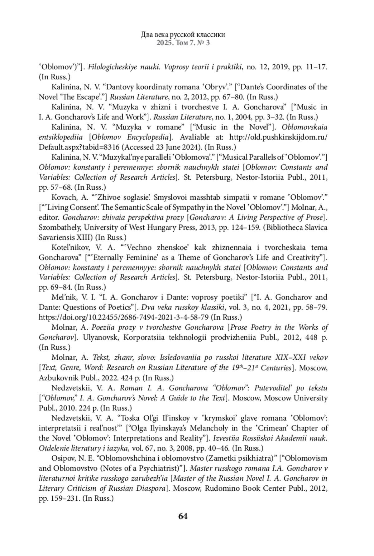 22. Калинина Н. В. Музыка в жизни и творчестве И. А. Гончарова // Русская литература. 2004. № 1. С. 3-32.