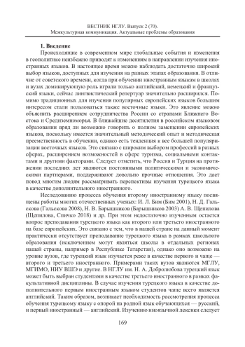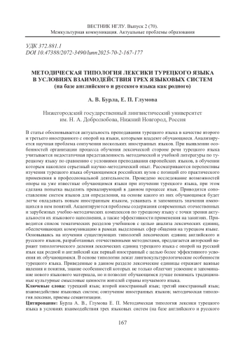 В статье обосновывается актуальность преподавания турецкого языка в качестве второго и третьего иностранного с опорой на языки, которыми владеют обучающиеся. Анализируется научная проблема соизучения нескольких иностранных языков. При выявлении особенностей организации процесса обучения лексической стороне речи турецкого языка учитывается недостаточная представленность методической и учебной литературы по турецкому языку по сравнению с условиями преподавания европейских языков, в обучении которым накоплен серьезный научно-методический опыт. Рассматриваются перспективы изучения турецкого языка обучающимися российских вузов с позиций его практического применения в профессиональной деятельности. Проведено исследование возможностей опоры на уже известные обучающимся языки при изучении турецкого языка, при этом сделана попытка выделить превалирующий в данном процессе язык. Приводится сопоставление систем языков для определения, на основе какого из них обучающимся будет легче овладевать новым иностранным языком, усваивать и запоминать значения имеющихся в нем понятий. Акцентируются проблемы содержания современных отечественных и зарубежных учебно-методических комплексов по турецкому языку с точки зрения актуальности их языкового наполнения, а также эффективности применения на занятиях. Приводится список тематических разделов учебников с целью анализа лексических единиц, обеспечивающих коммуникацию в рамках выделенных сфер общения на турецком языке. Основываясь на изучении существующих типологий лексических единиц английского и русского языков, разработанных отечественными методистами, предлагается авторский вариант типологического деления лексических единиц турецкого языка с опорой на русский язык как родной и английский как первый иностранный с целью более эффективного усвоения их обучающимися. В основе типологии лежат лингвокультурологические особенности турецкого языка. Приведенные в данном разделе лексические единицы отражают важные явления и понятия, знание особенностей которых не только облегчит усвоение и запоминание нового языкового материала, но и позволит обучающимся лучше понимать традиционные культурные смысловые ценности жителей страны изучаемого языка.