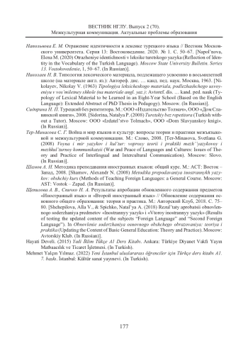 8. Напольнова Е. М. Отражение идентичности в лексике турецкого языка // Вестник Московского университета. Серия 13: Востоковедение. 2020. № 1. С. 50-67. EDN: SQVNZZ