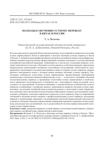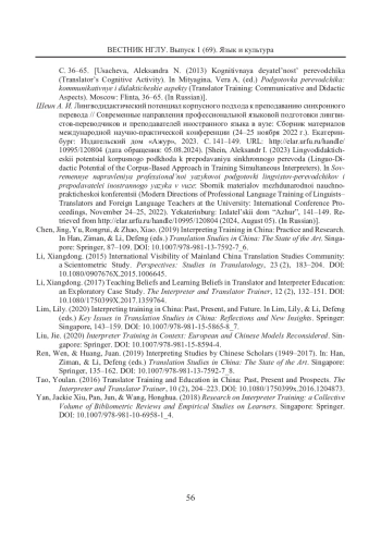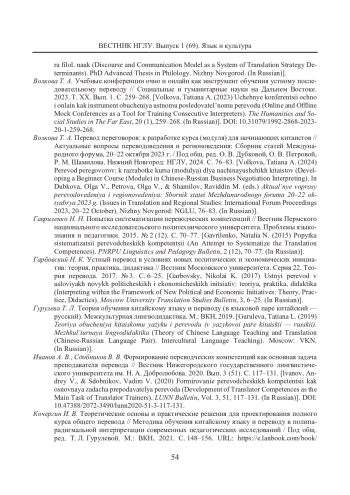 6. Волкова Т. А. Перевод переговоров: к разработке курса (модуля) для начинающих китаистов // Актуальные вопросы переводоведения и регионоведения: Сборник статей Международного форума, 20-22 октября 2023 г. / Под общ. ред. О. В. Дубковой, О. В. Петровой, Р. М. Шамилова. Нижний Новгород: НГЛУ, 2024. С. 76-83. [Volkova, Tatiana A. (2024) Perevod peregovorov: k razrabotke kursa (modulya) dlya nachinayushchikh kitaistov (Developing a Beginner Course (Module) in Chinese-Russian Business Negotiation Interpreting). In Dubkova, Olga V., Petrova, Olga V., & Shamilov, Raviddin M. (eds.) Aktual’nye voprosy perevodovedeniya i regionovedeniya: Sbornik statei Mezhdunarodnogo foruma 20-22 oktyabrya 2023 g. (Issues in Translation and Regional Studies: International Forum Proceedings 2023, 20-22 October). Nizhny Novgorod: NGLU, 76-83. (In Russian)]. EDN: ECMIQV
