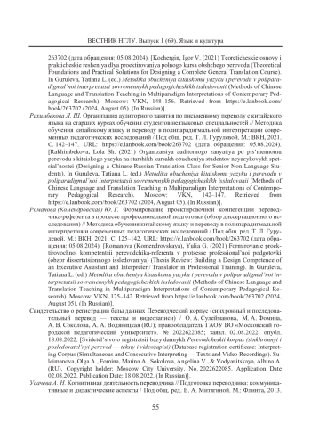 11. Кочергин И. В. Теоретические основы и практические решения для проектирования полного курса общего перевода // Методика обучения китайскому языку и переводу в полипарадигмальной интерпретации современных педагогических исследований / Под общ. ред. Т. Л. Гурулевой. М.: ВКН, 2021. С. 148-156. URL: https://e.lanbook.com/book/ 263702 (дата обращения: 05.08.2024). [Kochergin, Igor V. (2021) Teoreticheskie osnovy i prakticheskie resheniya dlya proektirovaniya polnogo kursa obshchego perevoda (Theoretical Foundations and Practical Solutions for Designing a Complete General Translation Course). In Guruleva, Tatiana L. (ed.) Metodika obucheniya kitaiskomu yazyku i perevodu v poliparadigmal’noi interpretatsii sovremennykh pedagogicheskikh issledovanii (Methods of Chinese Language and Translation Teaching in Multiparadigm Interpretations of Contemporary Pedagogical Research). Moscow: VKN, 148-156. Retrieved from https://e.lanbook.com/ book/263702 (2024, August 05). (In Russian)].