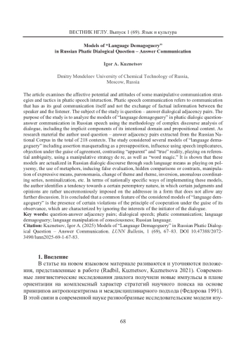 28. Radbil, Timur B., Kuznetsov, Igor A., & Kuznetsova, Tatyana I. (2021) Nationally Conditioned Models of Manipulative Communication in Russian Dialogical Speech. Communication Studies, 8, 3, 481-496. DOI: 10.24147/2413-6182.2021.8(3).481-496 EDN: GWQPSY